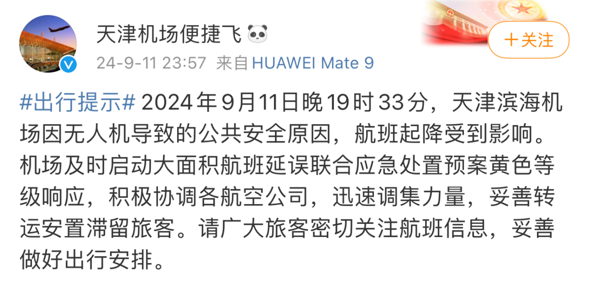 至當晚11時許,天津濱海機場微博官方賬號發布消息指,9月11日晚上7時33分,因無人機導致的公共安全原因,航班起降受到影響。機場及時啟動大面積航班延誤聯合應急處置預案黃色等級響應,積極協調各航空公司,迅速調集力量,妥善轉運安置滯留旅客。並請廣大旅客密切關注航班信息,妥善做好出行安排。