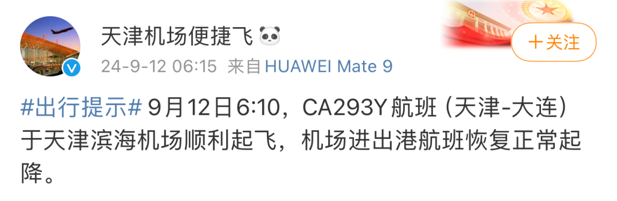 然而,9月12日上午6時許,天津濱海機場微博官方賬號發布消息指,CA293Y航班(天津往大連)已於天津濱海機場順利起飛,機場進出港航班回復正常起降。然而,機場於當晚卻又出現第二次航班起降延誤問題,引發廣大旅客不滿。