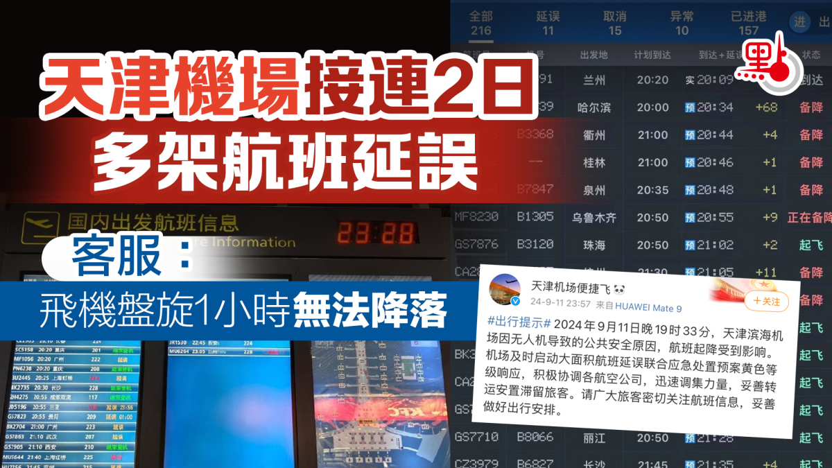 【點新聞報道】據內地傳媒報道,9月12日晚上8時許,天津濱海機場出現無飛機出港、進港飛機多數盤旋等待的情況,並大面積停止航班起降1個多小時。機場客服回覆旅客查詢時表示,因公共安全原因,從晚8時許至晚9時許的一個小時內,原應落地的逾10個航班均無法降落。這是濱海機場繼9月11日之後,連續第二天出現航班延誤的情況。