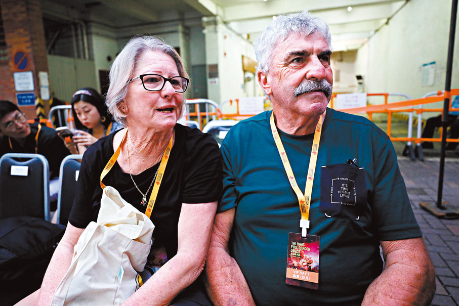 幕幕壯觀景象令外國及內地旅客大開眼界。由澳洲來港旅遊的Bob和妻子Yvonne對香港文匯報表示,活動令他們畢生難忘。他們今次訪港行程三天,抵港時獲香港旅遊發展局的旅客諮詢中心職員推介舞火龍活動,因此特意前來觀賞。兩夫婦對如此長的火龍能在小街小巷內遊走,直言十分新奇。