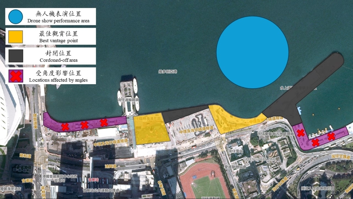 警方提醒市民,屆時灣仔海濱附近一帶將進行人流管制,另外放出多個最佳觀賞位置,包括灣仔海濱公園、灣仔渡輪碼頭、博覽道、龍和道、鴻興道、港灣道、杜老誌道、馬師道等一帶,均可欣賞到精彩演出。