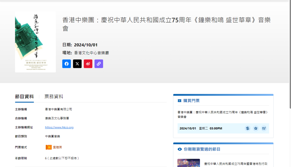 為慶祝國慶75周年,音樂會門票票價定為75元,現於城市售票網發售。首75名透過香港中樂團網站成功登記的75歲長者,每人可獲贈兩張免費門票。市民亦可免費參與中午12時在香港文化中心音樂廳舉行的演前導賞,認識編鐘的歷史和欣賞示範表演。同時,參加者可在香港文化中心2樓大堂近距離觀賞部分編鐘並拍照留念。