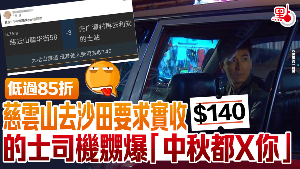 【點新聞報道】中秋節洋溢歡樂氣氛,但有的士司機卻嬲爆在社交平台發帖,指有乘客電召的士由慈雲山去沙田廣源邨再去利安邨的士站,竟開出比「八五折」更低的價格140元,令司機直呼「真係中秋節都要開post XX你!」。