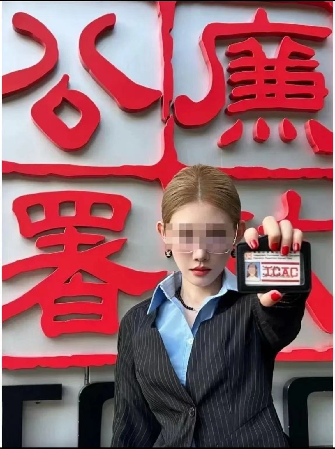 照片可見,該博主在北角廉署總部門口裝扮成調查員,還展示有自己名字的「委任證」。據悉,該名劉姓30歲女子於社交平台標明職業為模特及時尚博主,她發帖稱,「ICAC查案!不方便透露!這兒是TVB迷來香港必去的吧!」隨後該女子將「委任證」近照刪除。