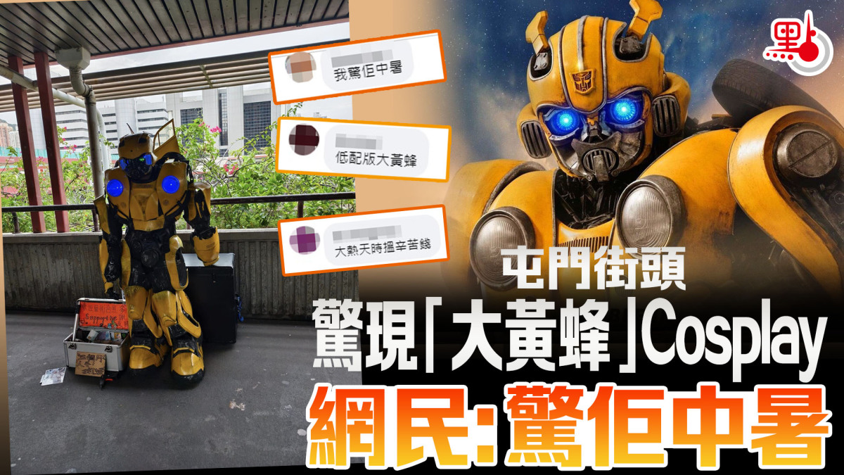 【點新聞報道】屯門街頭出現《變形金剛》電影中的「大黃蜂」真人版!有網民近日在社交平台分享一張相片,可見有人身穿變形金剛系列中的「大黃蜂」鐵甲裝戲服,進行街頭藝術表演。不少網民擔心表演者會中暑,「噢!好熱」、「我驚佢中暑」、「咁熱都唔知佢會唔會中暑」。