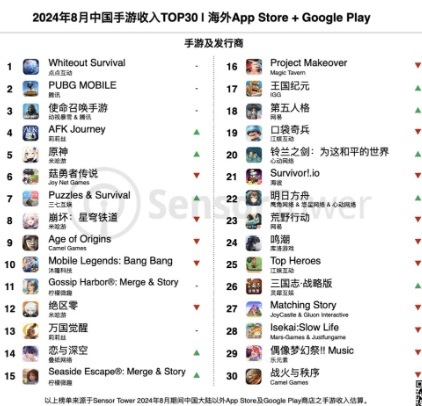 繼總收入突破10億美元後,8月末日題材生存策略手遊《Whiteout Survival無盡冬日》在內地和海外市場均創下新的月收入紀錄,使得發行商點點互動本期收入環比提升15%,首次摘得內地手遊發行商收入榜前三。