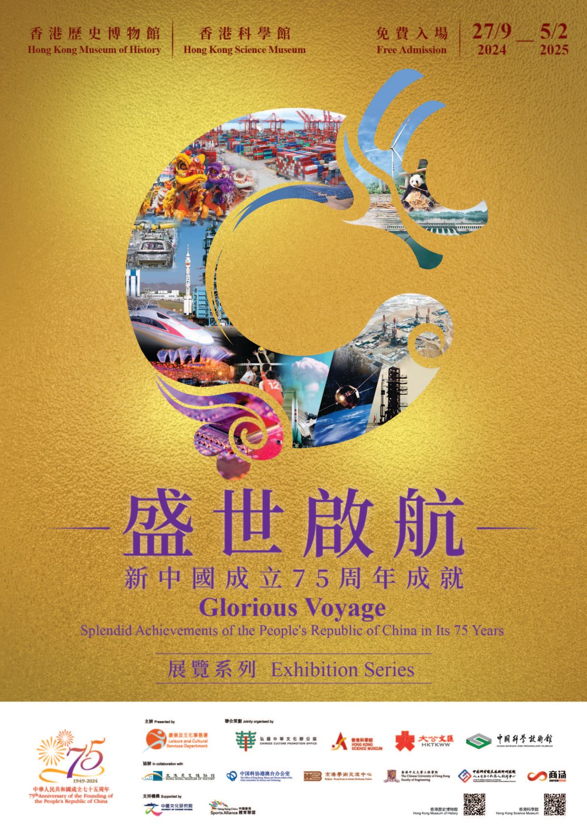 「盛世啟航——新中國成立75周年成就」展覽系列透過多維度的探索,讓市民了解新中國七十五年來砥礪奮進的全面發展進程,增加對國家和民族的認識。系列涵蓋三個展覽:「科技創新」展示中國的科技事業從無到有、從弱到強,以及不同年代科學家的偉大功業;「智慧時代」介紹近年急速發展的人工智能(AI)創新科技,體現AI與中國文化的交融;「飛躍發展」展現中國在經濟發展、基礎建設、文化事業、體育發展及生態保育五大領域的發展和成就,該展覽還將特別展出運動健兒於不同奧運會及殘奧會贏得的獎牌,與市民分享刻苦訓練的成果。