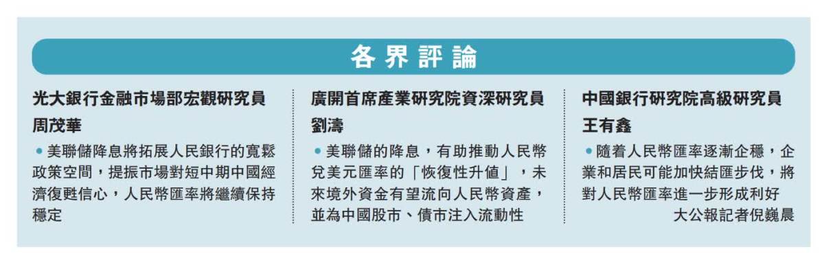 瑞穗銀行首席亞洲匯率策略師張建泰表示,美聯儲減息半厘為中國人行減息提供更多空間。