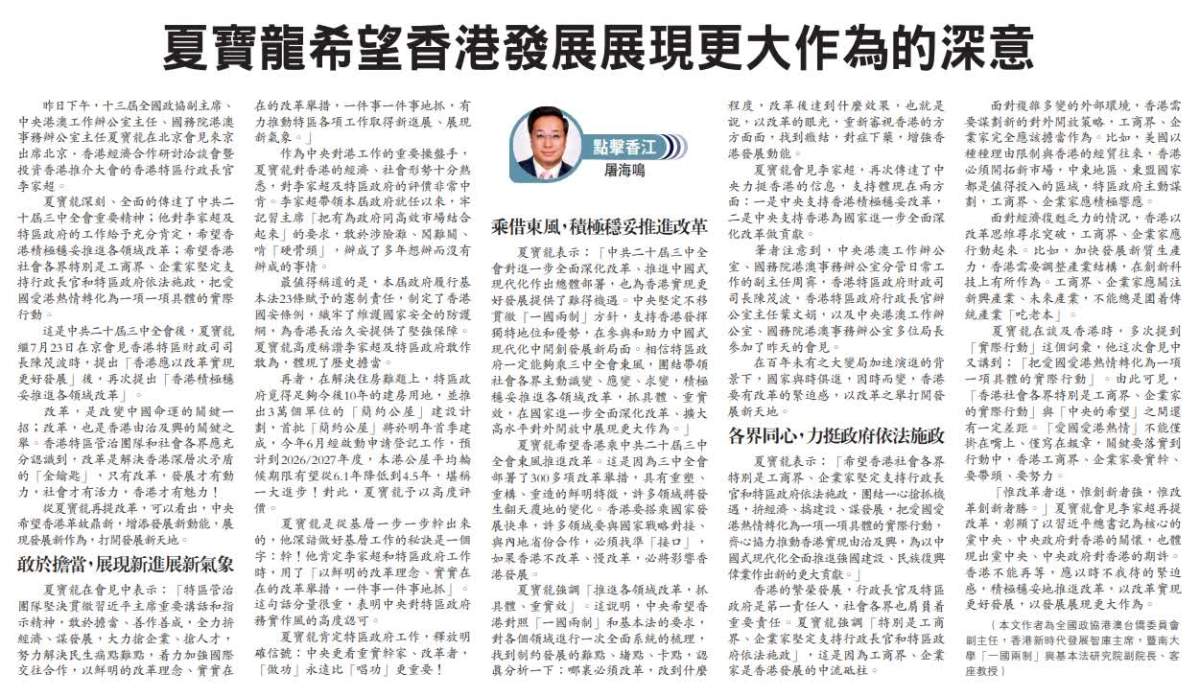 這是中共二十屆三中全會後,夏寶龍繼7月23日在京會見香港特區財政司司長陳茂波時,提出「香港應以改革實現更好發展」後,再次提出「香港積極穩妥推進各領域改革」。