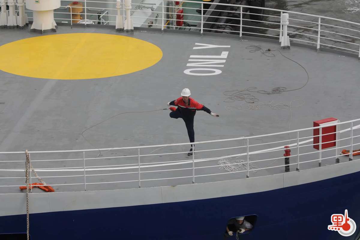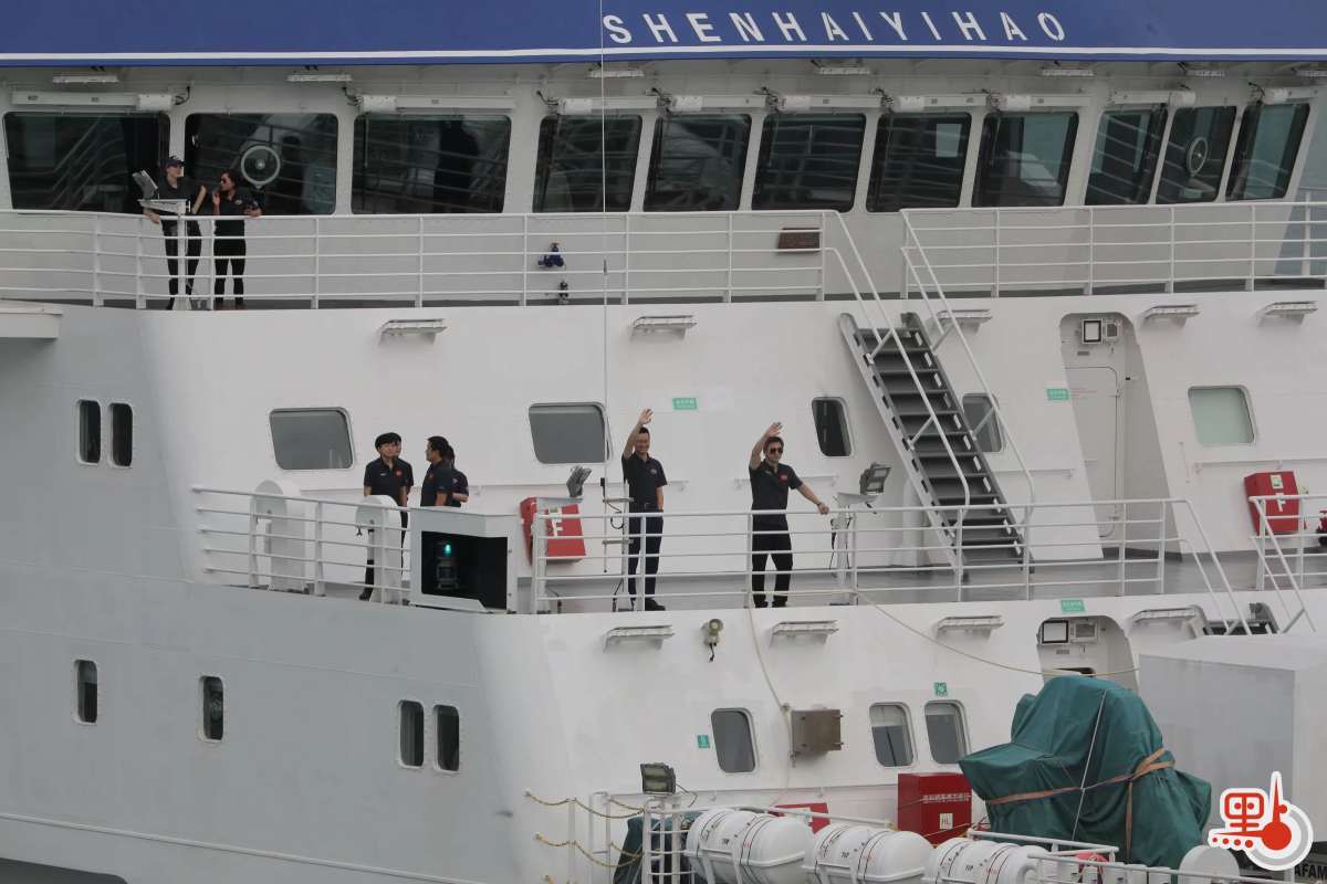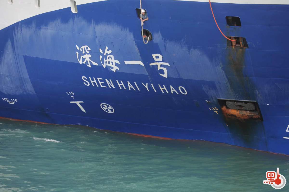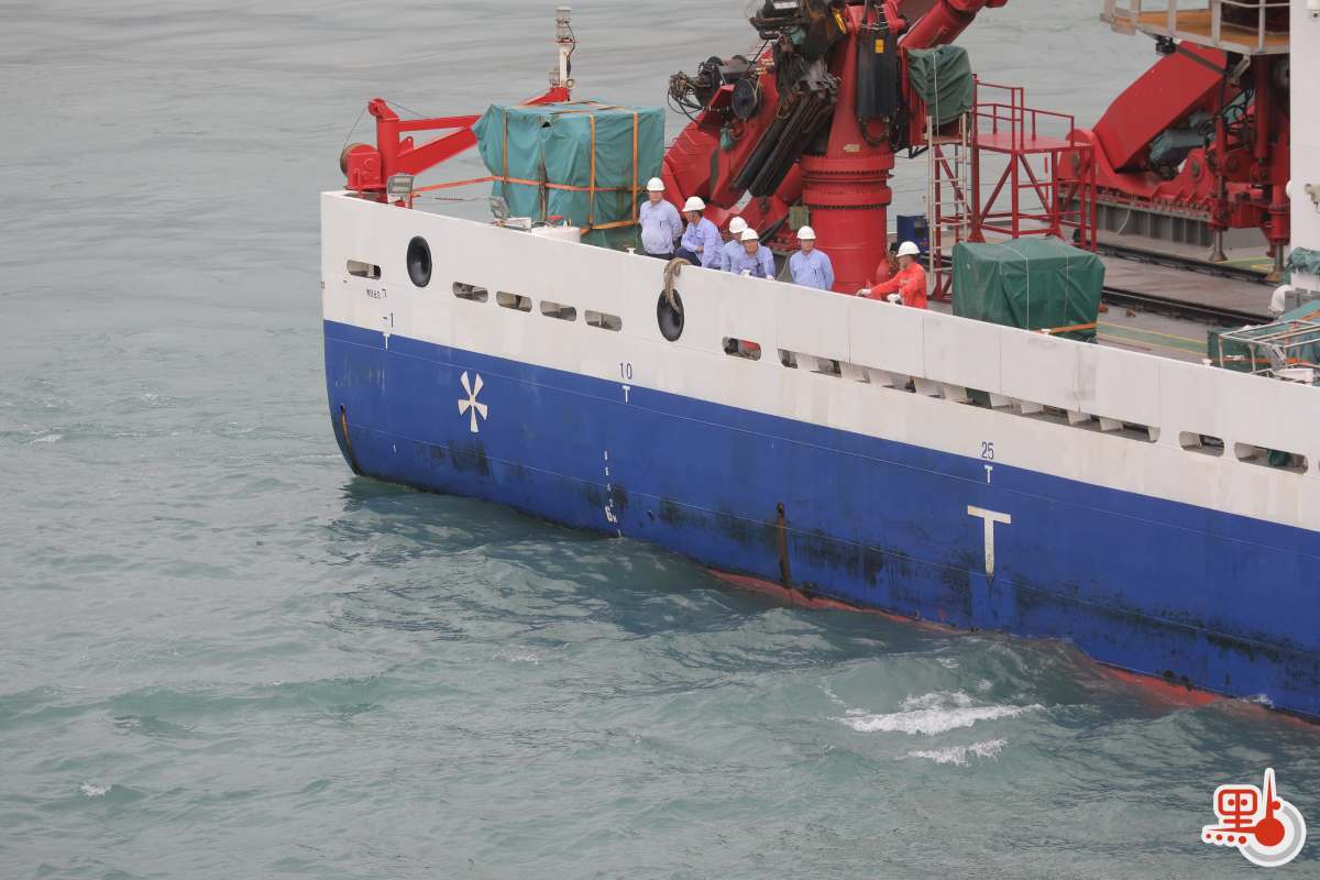 早上8點,「深海一號」緩緩駛入尖沙咀碼頭,而「蛟龍號」則在船艙中若隱若現,在船隻即將靠岸時,船上的科學家熱情向岸邊市民揮手、「比心」。深藍與淺白相交的龐大船體停泊在港口中,高大的船身與蔚藍的海水形成鮮明的對比,展現出一種威武霸氣的姿態。