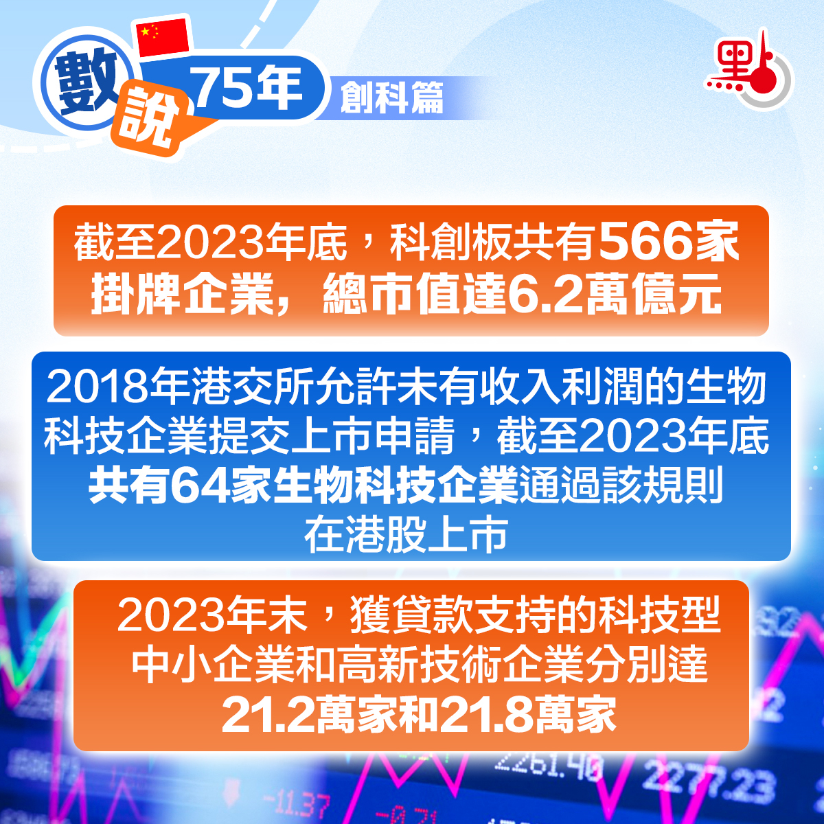 2013年設立「新三板」,2019年設立「科創板」,重點滿足科創型企業直接融資需求。截至2023年底,科創板共有566家掛牌企業,總市值達6.2萬億元。2018年港交所允許未有收入利潤的生物科技企業提交上市申請,截至2023年底共有64家生物科技企業通過該規則在港股上市。2023年末,獲得貸款支持的科技型中小企業和高新技術企業分別達21.2萬家和21.8萬家,本外幣貸款餘額達2.5萬億元和13.6萬億元。