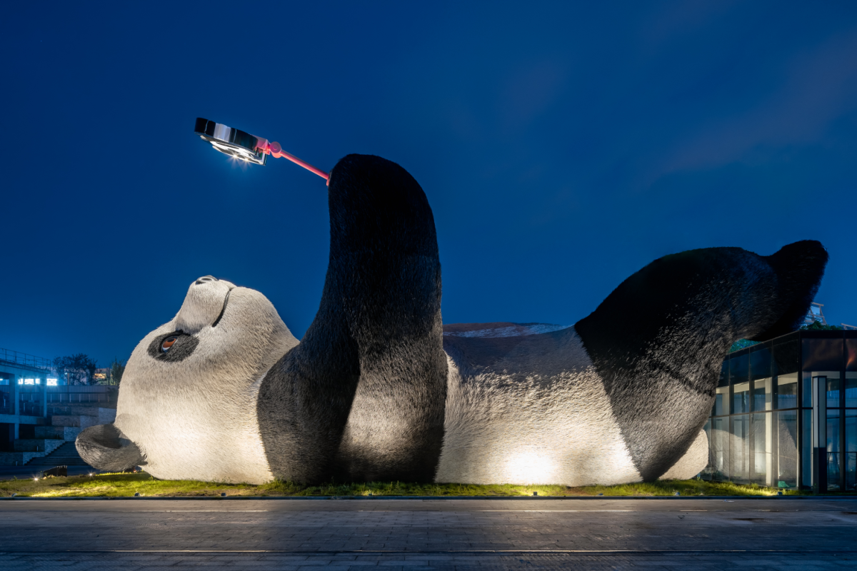 作為都江堰地標之一的「仰天窩廣場」,有藝術家三年前在此擺設「自拍」形態的巨型大熊貓雕塑,成為當地新地標,吸引民眾旅客到場打卡拍照留念,廣場又設有售賣熊貓精品的攤檔,也有以熊貓為主題的飲品檔、攤位遊戲和網紅直播間。
