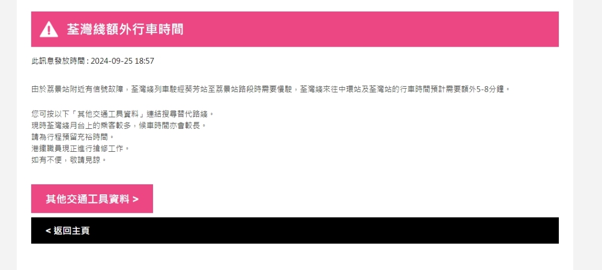 【點新聞報道】港鐵今日(25日)下午6時57分表示,由於荔景站附近有信號故障,荃灣綫列車駛經葵芳站至荔景站路段時需要慢駛,荃灣綫來往中環站及荃灣站的行車時間預計需要額外5至8分鐘。
