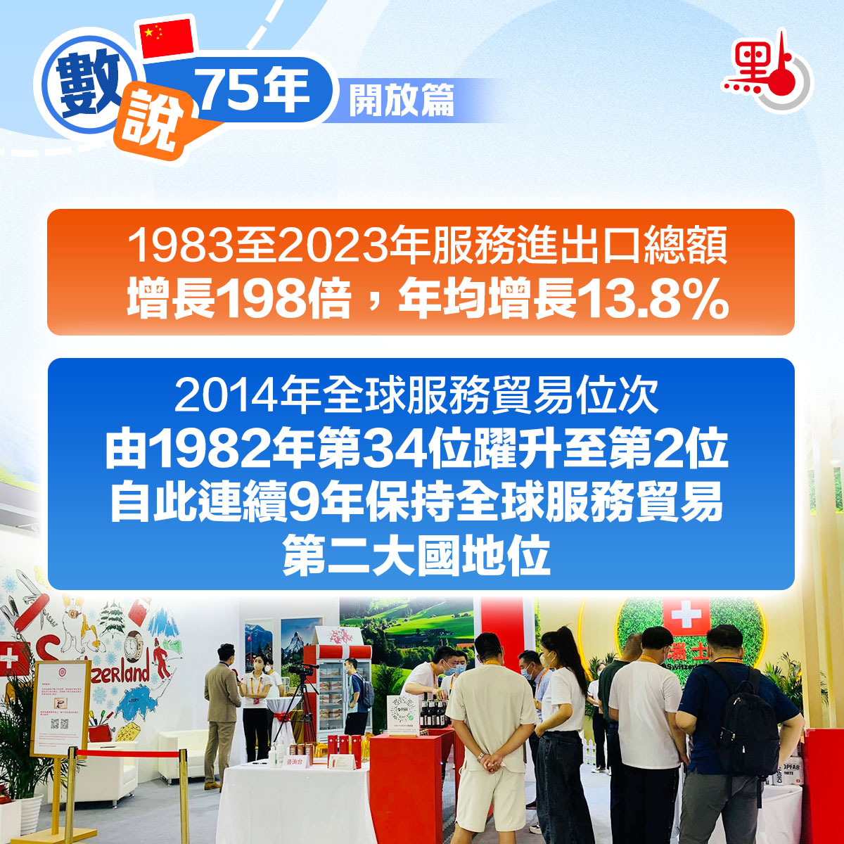 新中國成立以來,我國服務貿易進出口規模日益擴大。改革開放前,服務貿易僅局限在少量對外技術援助和來華旅遊服務。改革開放後,1983至2023年服務進出口總額增長198倍,年均增長13.8%。2014年,我國服務進出口總額佔全球服務貿易總額的比重由1982年的0.6%提高到6.3%,在全球服務貿易的位次由1982年的第34位躍升至第2位,自此連續9年保持全球服務貿易第二大國地位。