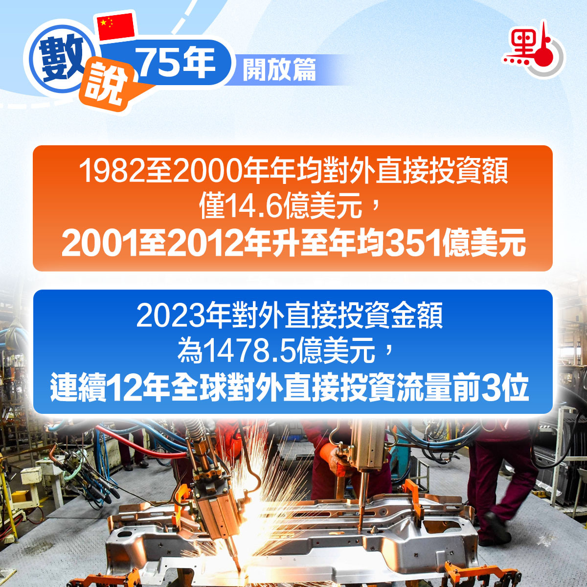 「走出去」戰略提出以來,我國積極參與國際交流與合作。1979年,國務院提出「出國辦企業」,但1982至2000年我國累計實現對外直接投資278億美元,年均對外直接投資額僅14.6億美元。2000年,九屆全國人大三次會議提出「走出去」戰略。2001年我國加入世界貿易組織後,2001至2012年年均對外直接投資額提升為351億美元。到了2023年我國對外直接投資金額為1478.5億美元,連續12年居於全球對外直接投資流量的前3位。