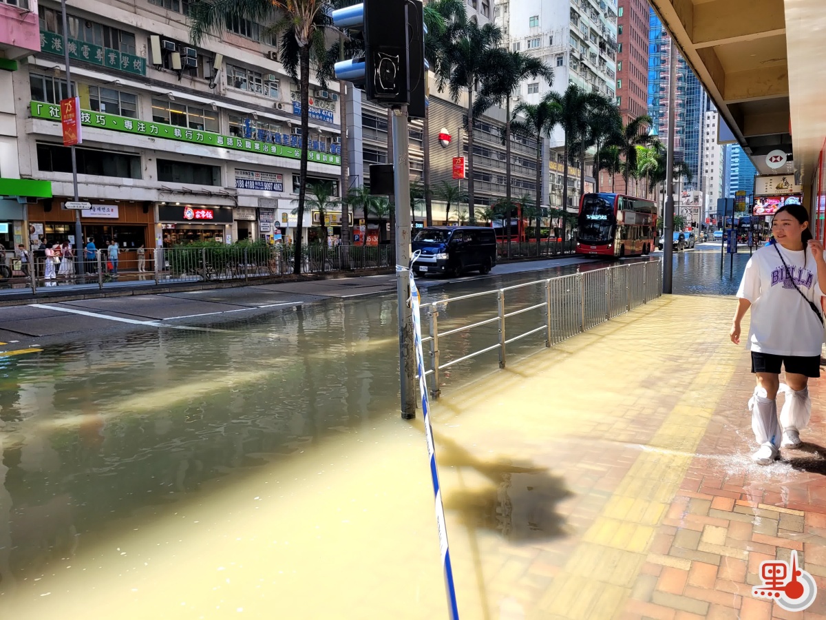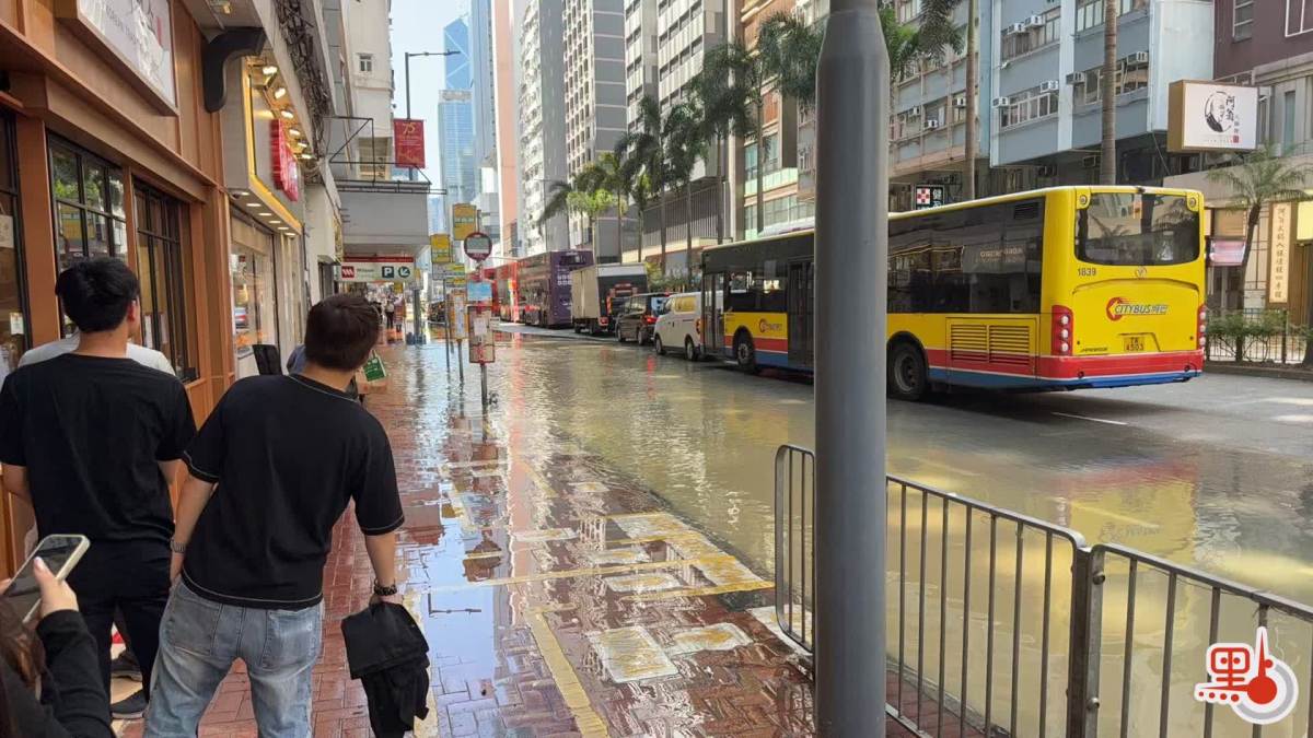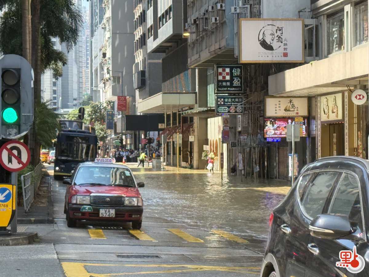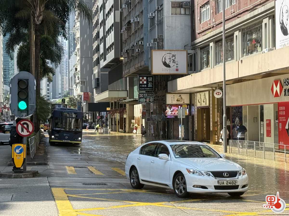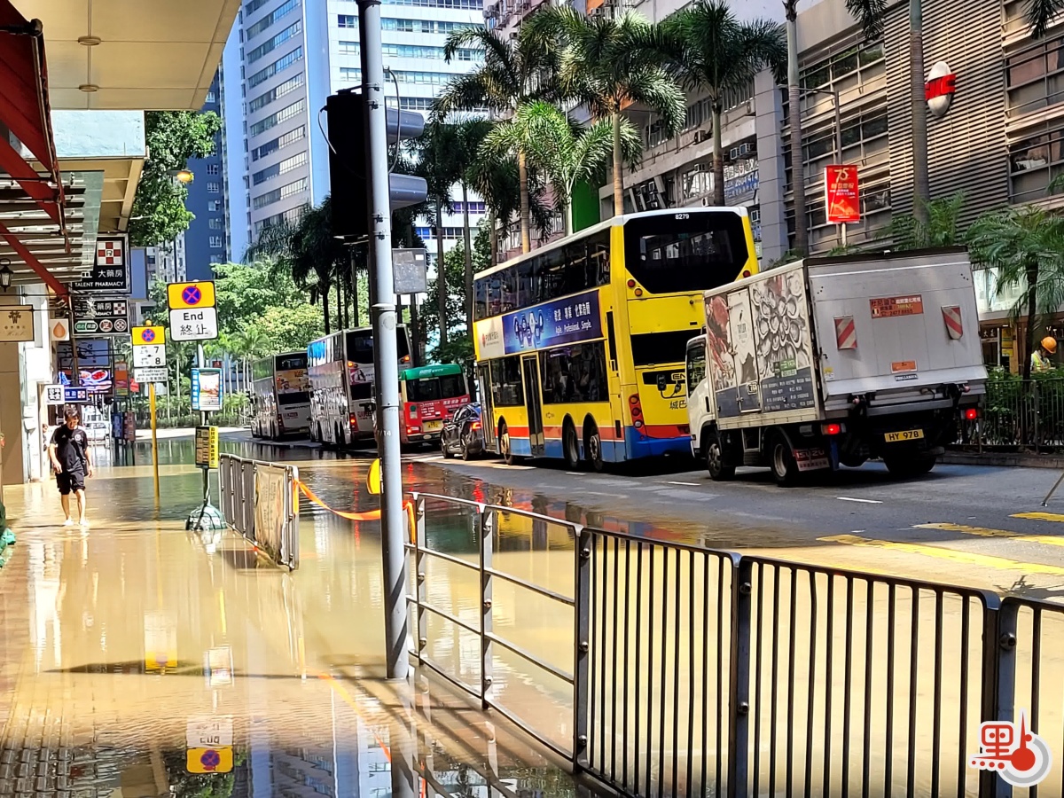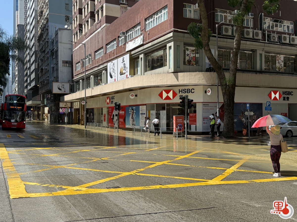 據點新聞記者在現場觀察,水浸範圍目測由東亞大樓到滙豐銀行一帶,臨街的巴士站已被淹,另一側路段亦被淹浸約一半。該路段交通堵塞,有交通警察在現場進行交通疏導。