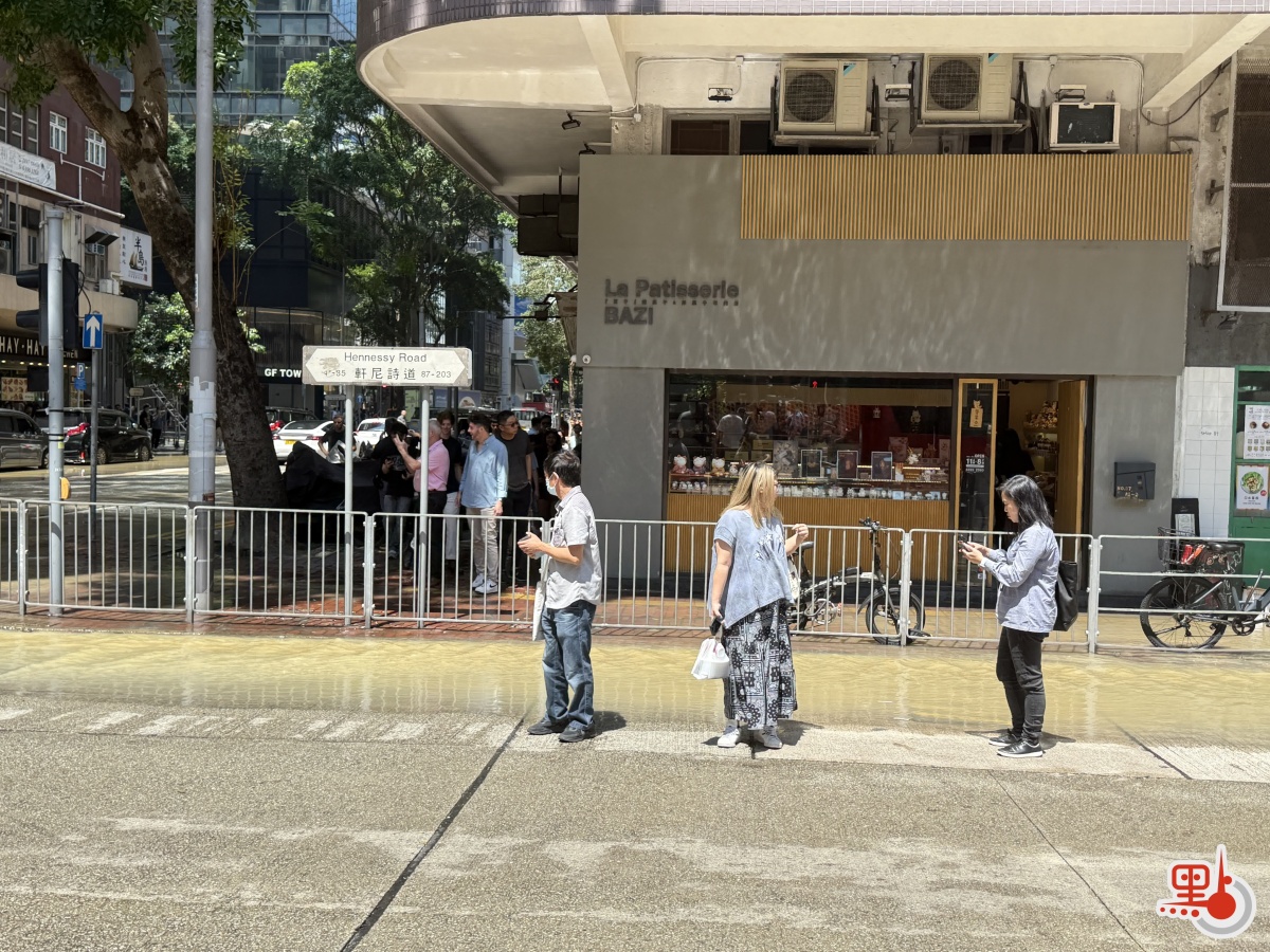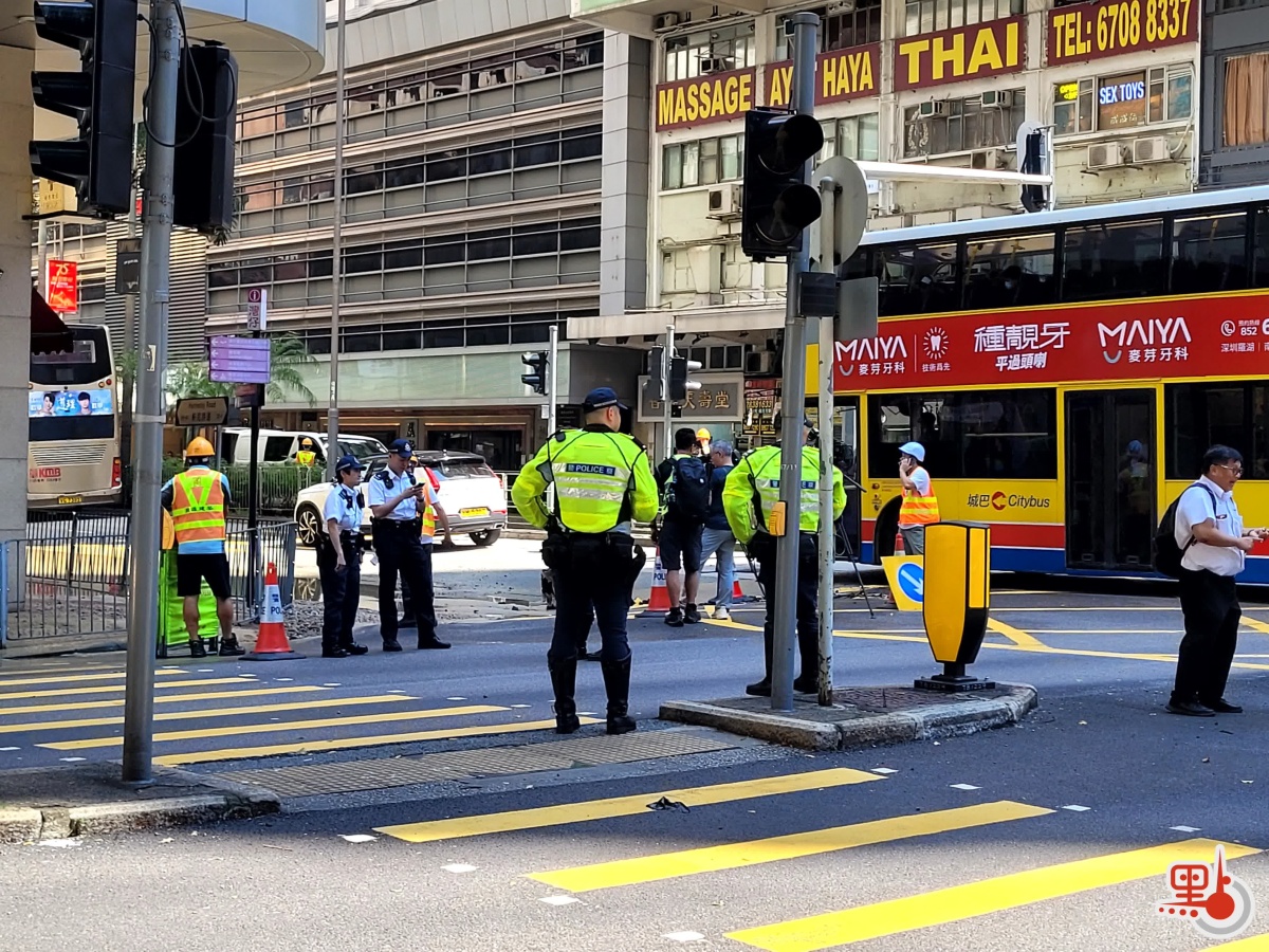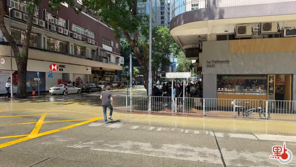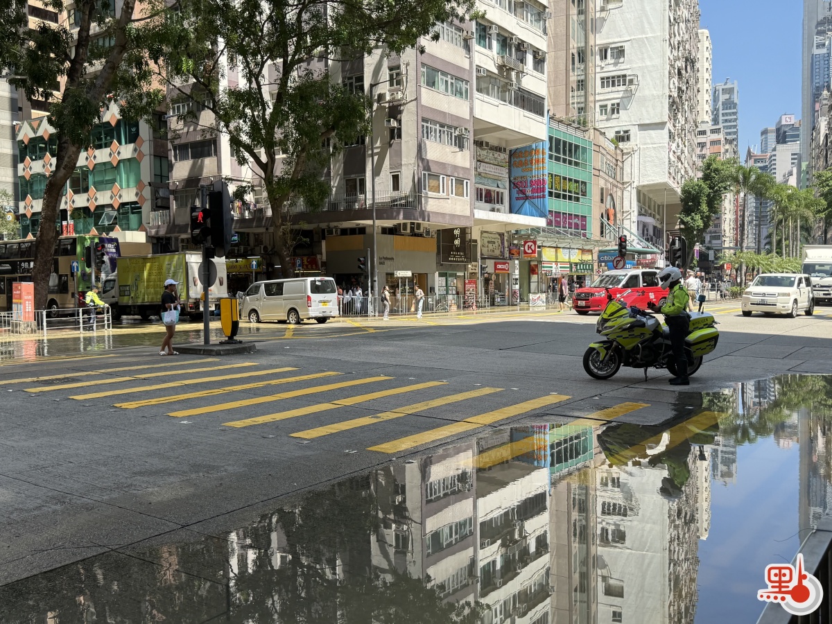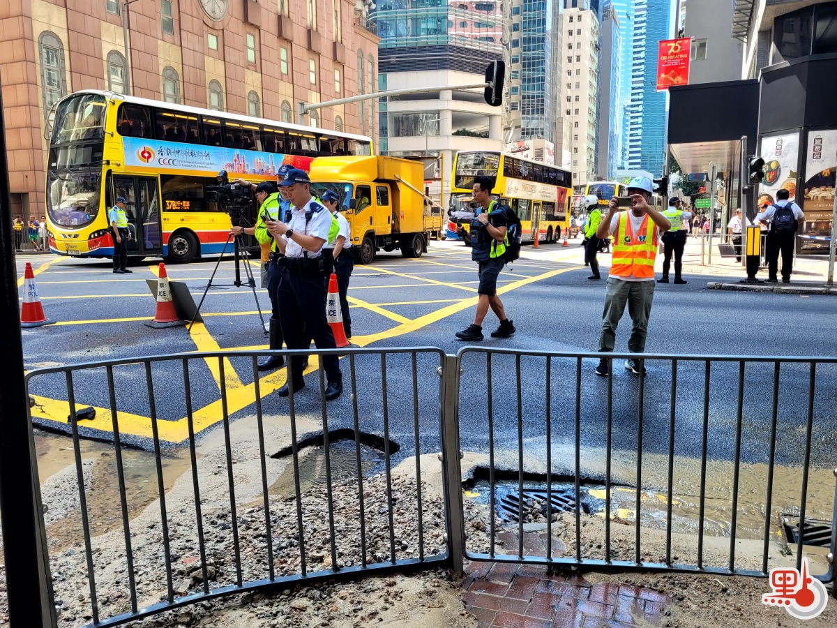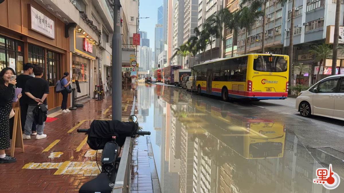 據點新聞記者在現場觀察,水浸範圍目測由東亞大樓到滙豐銀行一帶,臨街的巴士站已被淹,另一側路段亦被淹浸約一半。該路段交通堵塞,有交通警察在現場進行交通疏導。
