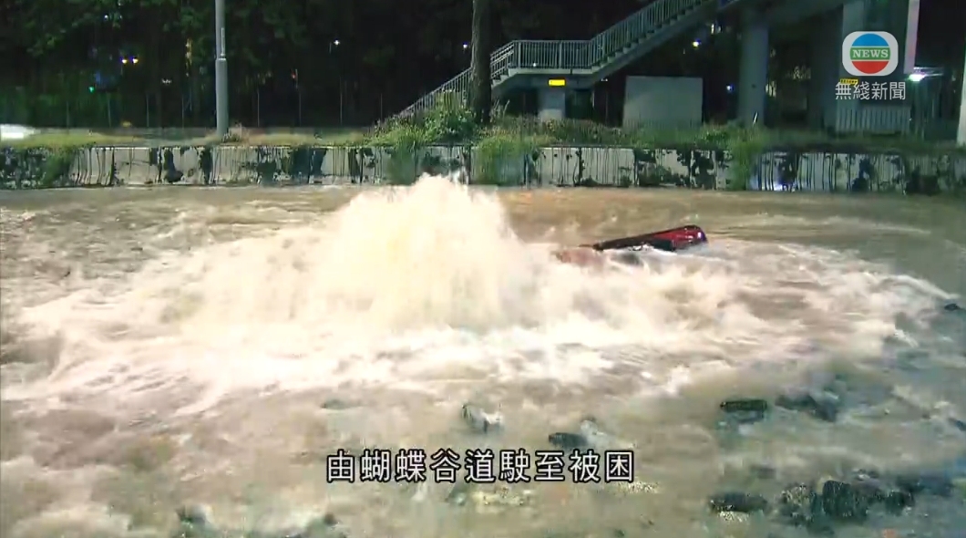 現場所見,涉事的士被困在路中,其後坑洞越變越大。凌晨1時50分左右,涉事的士已幾乎全面浸沒,從附近天橋鳥瞰,只見到一個車輪在「漩渦」之中。水務署人員趕往現場,於凌晨5時左右,成功將手掣關上。據了解,受影響範圍約30米。因路面地陷,附近一條行人天橋亦暫時封閉。