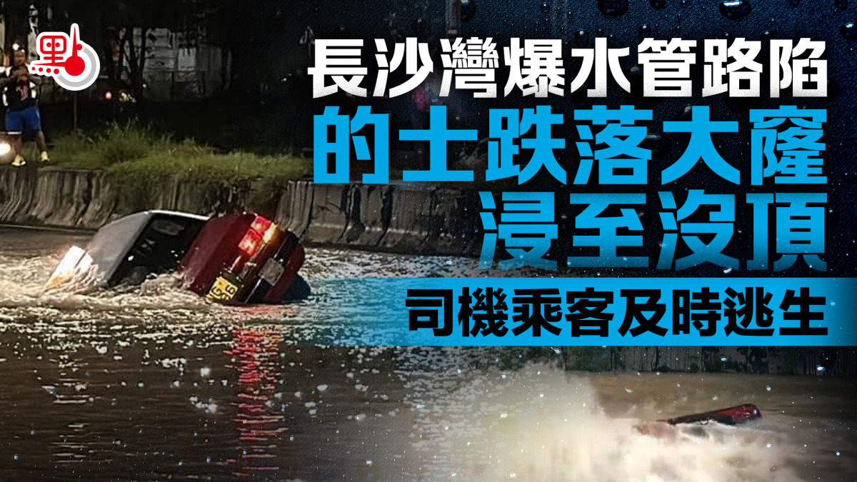 【點新聞報道】長沙灣荔枝角道今日(29日)凌晨發生爆水管及路陷意外。午夜12時半,一輛的士駛過積水路面時跌落大窿,大半車身傾側更被水浸住,險被爆水管所湧出的「洪水」沒頂,所幸司機及乘客及時逃生,其中司機疑腳部受傷,由救護車須送院治理。