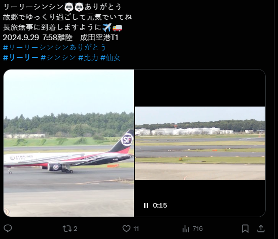 報道續指,昨日(28日)是牠們在日本最後一天對外亮相,吸引了大批遊客和日本民眾到場送別。報道說,在動物園開門前,就有超過2000人排隊等待1小時以上,更有人半夜就已經到場等候。