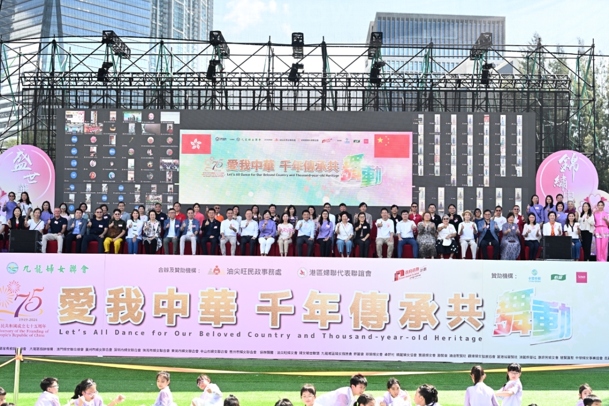 【點新聞報道】為慶祝中華人民共和國成立75周年,弘揚愛國主義教育,由九龍婦女聯會(以下簡稱聯會)主辦,油尖旺民政事務處及港區婦聯代表聯誼合辦的「愛我中華 千年傳承共舞動」活動,於今日(29日)在西九文化區的竹翠公園隆重舉行。此次活動旨在推動愛國主義教育,同時展現中華文化的獨特魅力,傳承民族家國情懷。