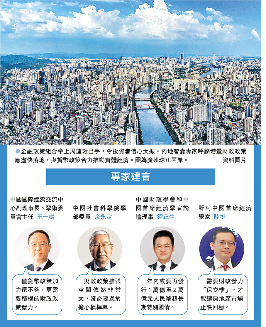 9月26日中央政治局會議釋放出穩增長信號,並提出「加力推出增量政策」;而此前兩天,力度空前的金融政策組合拳提前出手,涵蓋降息降準、支持房地產和股票市場等多領域,力度超出市場預期,令投資者信心大振,帶動股匯連日大漲。內地智囊專家呼籲增量財政政策盡快落地,通過增發國債等途徑幫助地方政府減輕債務壓力,擴大公共投資,最終與貨幣政策形成合力,推動實體經濟轉好。