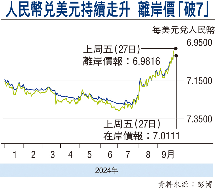 自美聯儲開啟降息後,加上一系列貨幣金融穩增長政策出台,人民幣匯率持續走升,離岸人民幣匯率已「破7」。中國社科院金融所副所長張明表示,近期人民幣升值破「7」有三個原因:從外部看,美聯儲降息導致美元指數回落;從內部看,由於美元回落,過去一段時間中國出口商手中積攢了大量美元,在美元貶值的情況下開始結匯,由此出現近期一波強勁的結匯浪潮,是前一段時間推動人民幣對美元反彈的一個重要原因;另外,最近一系列貨幣金融政策大禮包,會進一步激發市場對國內資產價格以及經濟增長的預期,進而推動匯率走升。