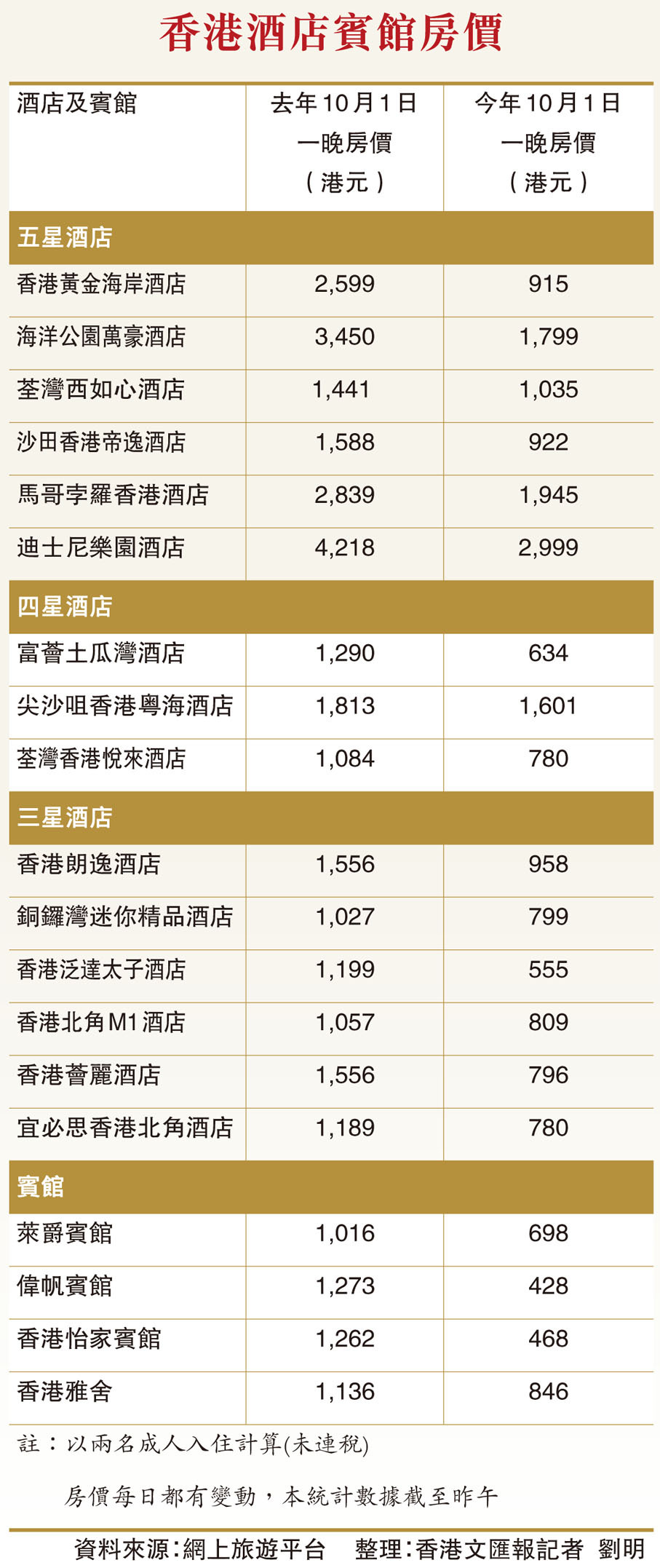 例如,屯門區一間五星級酒店,今日一晚房價未連稅索價915元,較去年國慶首天索價近2,600元的房價,大跌近65%;同樣有沙田區五星級酒店房價亦較去年同期下跌近43%,今日一晚房價只要922元。至於四星及三星酒店,今日房價不少只索價數百元,較去年動輒上千元一晚相比,明顯回落。