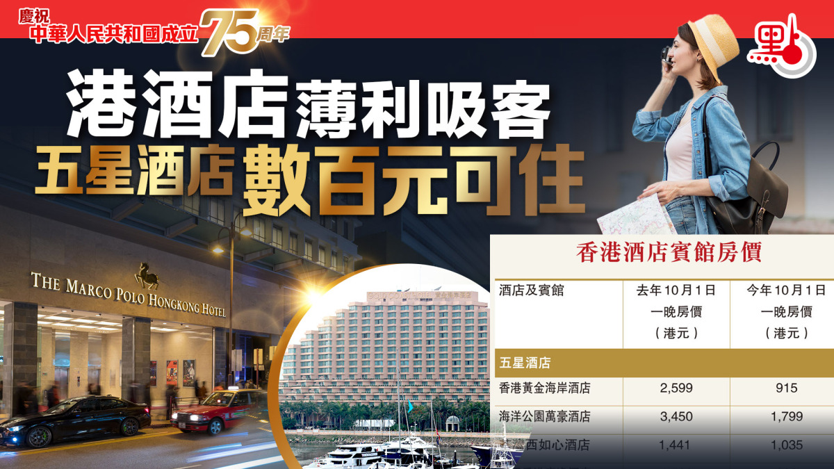 今日(10月1日)迎來中華人民共和國成立75周年,為期7天的國慶黃金周亦拉開序幕,估計期間有多達120萬人次旅客訪港。香港文匯報發現,與去年同期相比,今年香港酒店房價大幅下跌,有五星級酒店在黃金周首天房價下跌逾六成,一晚房價低至數百元「有交易」。有酒店業界人士昨日向香港文匯報記者解釋,由於今年內地國慶長假只有7天,不似去年中秋連同國慶有更長假期,部分內地旅客不經香港到海外旅行,而是由內地直飛海外,加上港元匯率強勁等因素,香港酒店業遂劈價吸客,此招亦相當奏效,酒店業整體入住率維持八至九成。