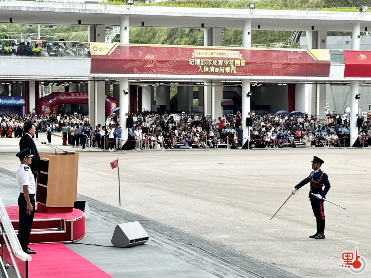 主禮嘉賓政務司司長陳國基檢閱紀律部隊儀仗隊、青少年團體及制服團體。他在致辭時表示,社會各界積極響應政府呼籲,在全港各區舉辦多姿多彩的慶祝國慶活動,充分體現大家對祖國的熱愛及未來美好的祝願;而各支紀律部隊及輔助部隊以及青少年團體隊伍的表演,亦展現大家團結一致,維護國家尊嚴的堅定決心,令人鼓舞。他亦勉勵青少年為國家作出貢獻。