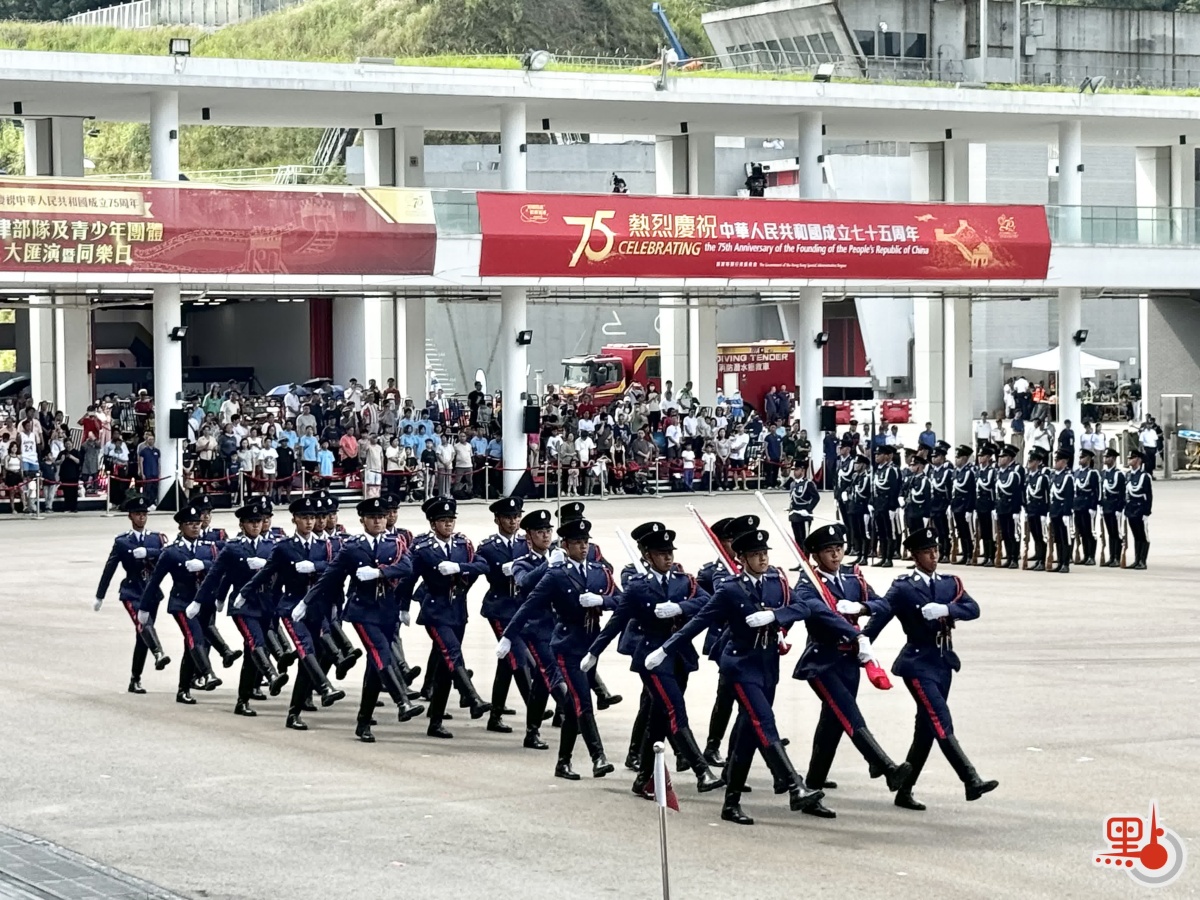 紀律部隊和青少年團體各方隊的列隊表演,共有140多名青少年精英參與,每一位成員都展現出無比的熱情和毅力。紀律部隊聯合步操表演隊形拼出五星紅旗的圖案,顯示出對國家的支持;同時拼出「75」的圖案,慶祝新中國成立75周年。除了精心訓練的匯操表演外,青少年還展現出傳統舞獅和武術的魅力與力量,他們為觀眾呈現了75周年的特別動作,祝願祖國繁榮昌盛、國強民富。