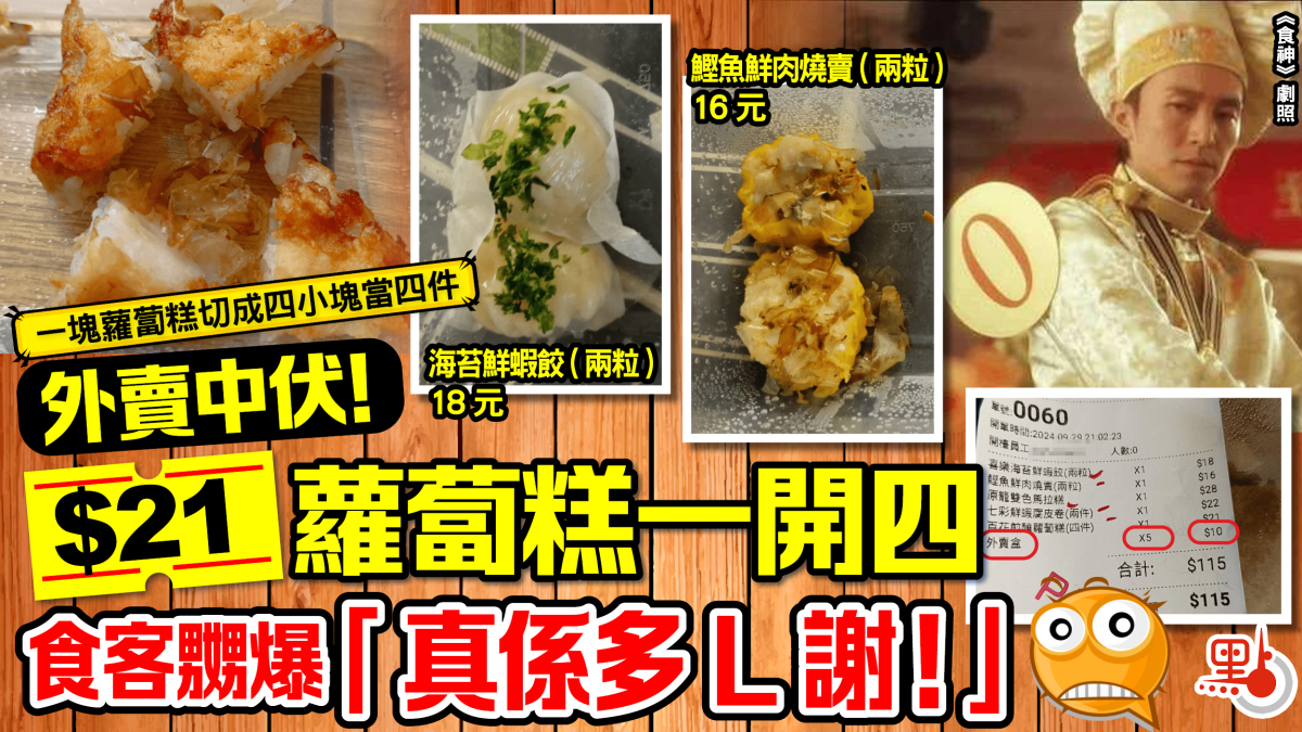 【點新聞報道】不少港人愛「一盅兩件」飲杯茶、食件點心。有網民近日光顧長沙灣一間點心店,外賣5款點心,承惠115元。豈料,回家打開一看,方知中伏,居然「一塊蘿蔔糕切成四小塊當四件」,樓主嬲爆揚言「無下次」。不少網民均認為店家將蘿蔔糕「一開四」的手法有問題。