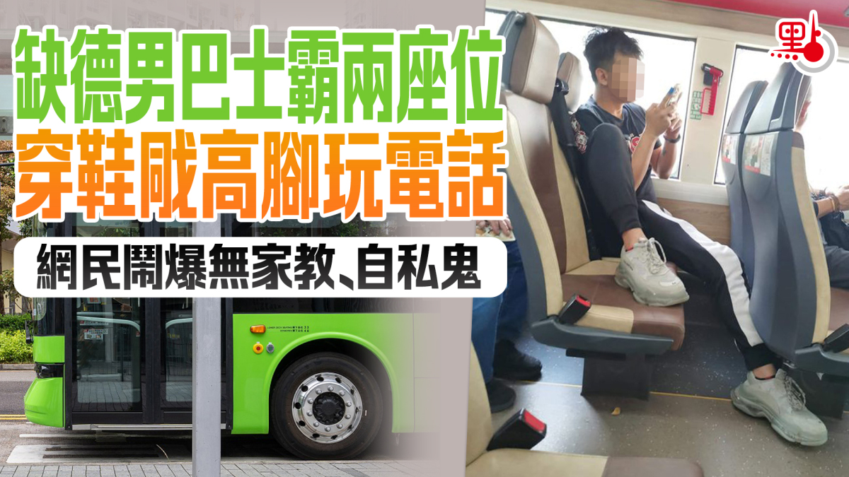有網民在fb群組「香港交通及突發事故報料區」發布相片,相中的巴士男乘客不但一人霸佔兩個座位,而且在玩電話期間,將一隻穿着鞋的腳,戙高放在其中一個座位上,極不合衞生,亦缺乏公德。不少網民看到該男乘客的惡行後,紛紛留言鬧爆「無品」、「衰格」、「無家教」、「自私鬼」、「個格同際遇都係成正比」、「冇家教又冇文化嘅自私鬼!」等。