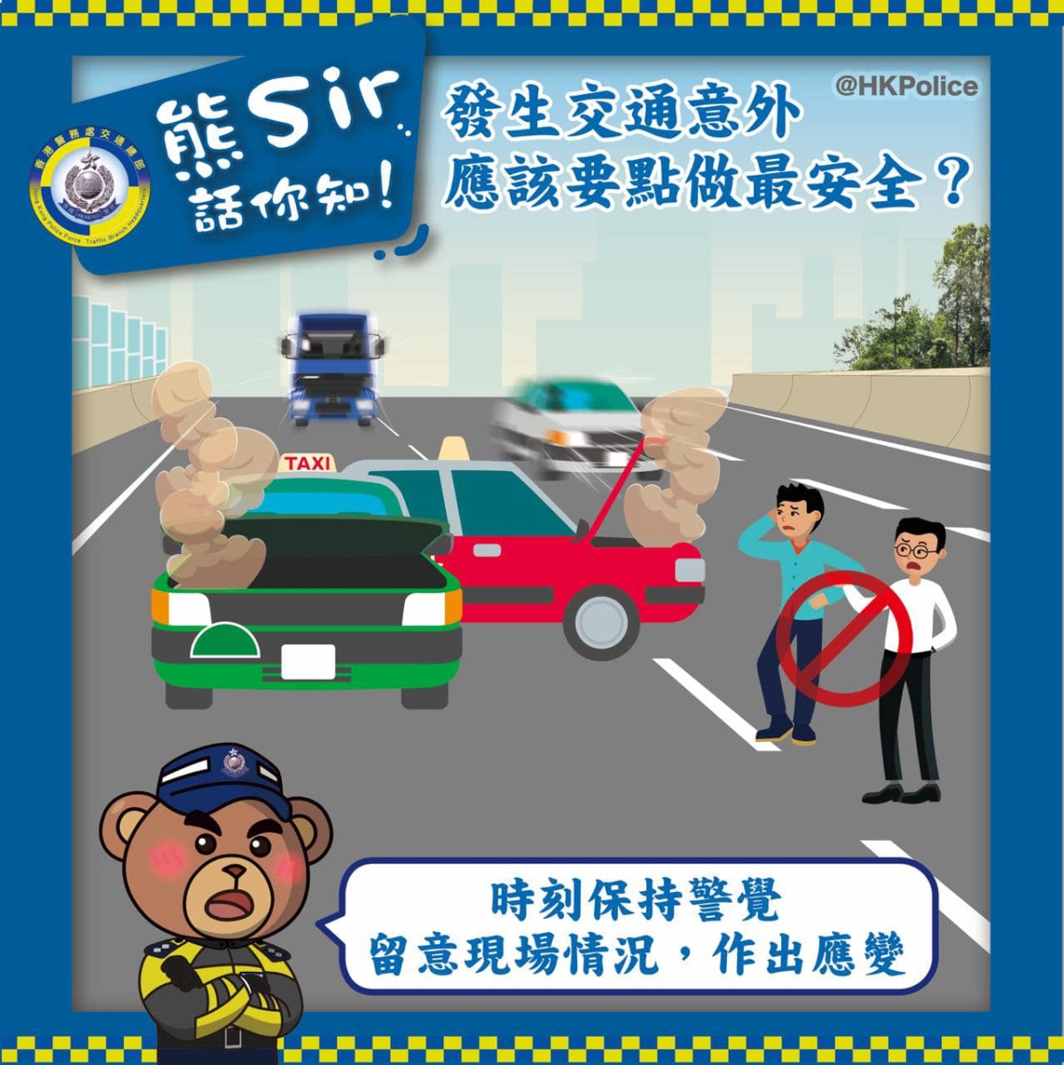就此事件,警方今日(10月2日)在社交平台提醒市民,當在馬路發生交通事故需要落車檢視車輛情況,以及與對方商討賠償或跟進時,司機和乘客應盡可能將車輛駛至安全地方,例如路肩或避車處等。如情況緊急必須落車,應注意以下4個安全事項,一切以自身安全為先。