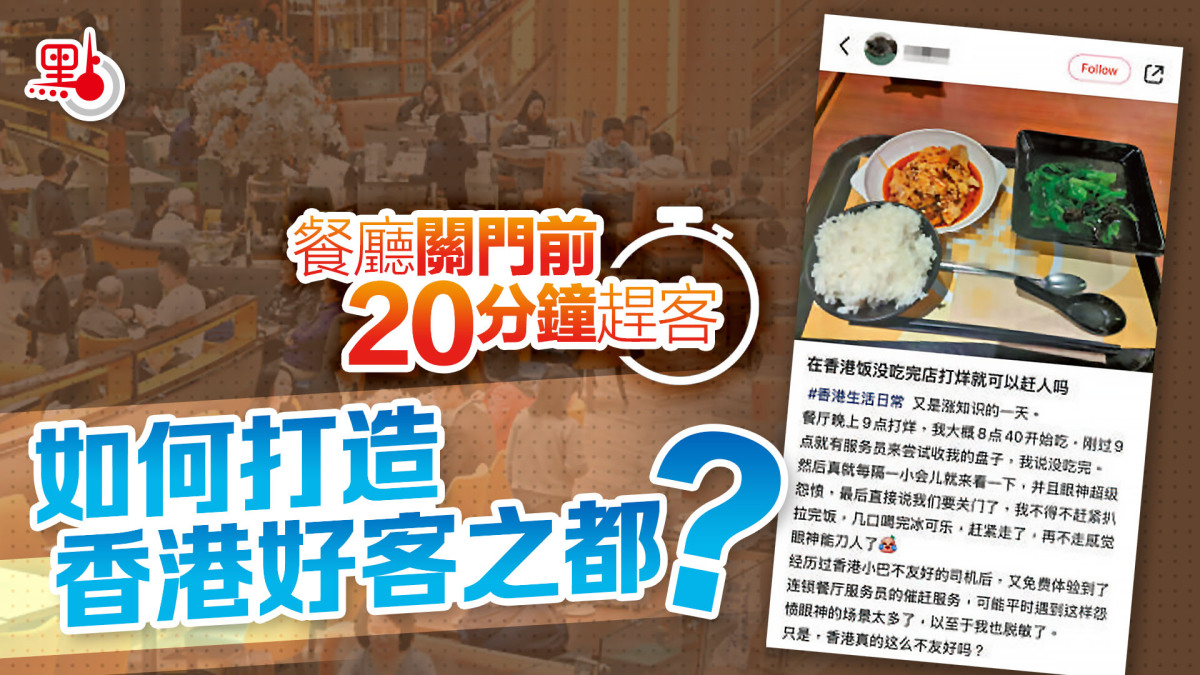 該名網民於9月底以「在香港飯沒吃完店打烊就可以趕人嗎?」為題發帖,指事發當晚光顧餐廳,點餐時見到店內還有不少顧客,她於8時40分開始吃飯,惟到了9時,職員便前來問她還吃不吃,嘗試收走其碗碟,「我說沒吃完。然後(服務員)真就每隔一小會兒就來看一下,並且眼神超級怨憤,最後直接說我們要關門了。我不得不趕緊扒拉完飯,幾口喝完冰可樂,趕緊走了,再不走感覺眼神能刀(殺)人了。」