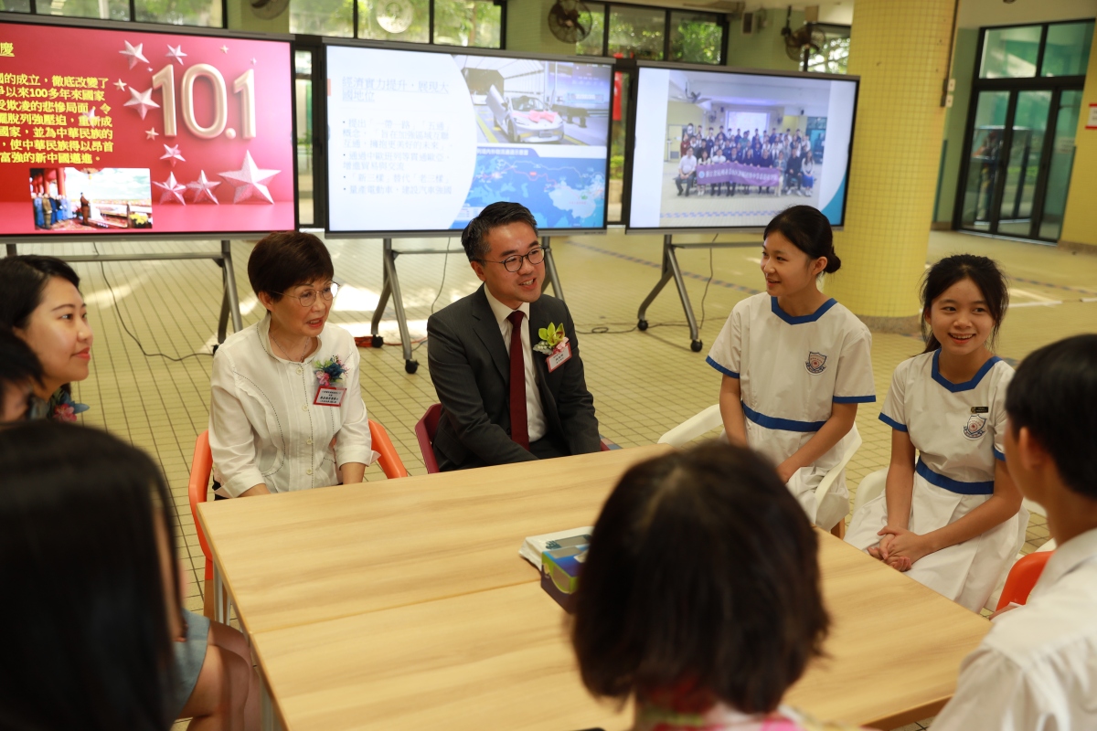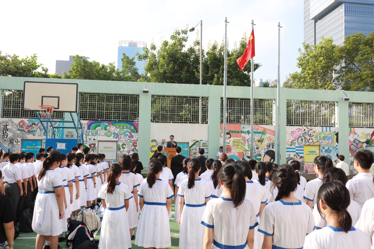 施局長鼓勵同學們珍惜學習機會,積極參與愛國活動,踐行愛國精神。我校一直以來積極響應,着力推動國民教育,致力於培養學生的愛國情懷和社會責任感。如參與「川流計劃」,校監羅嘉穗協助安排,校長、老師帶領下到訪北京,並與國內著名學者支振鋒交流。我校參與校際一帶一路綜合能力比賽獲得全港季軍,並到訪一帶一路沿線國家。我校亦推動全面多元的國史學習,並參與不同的交流團,認識我國河山與人民風情。