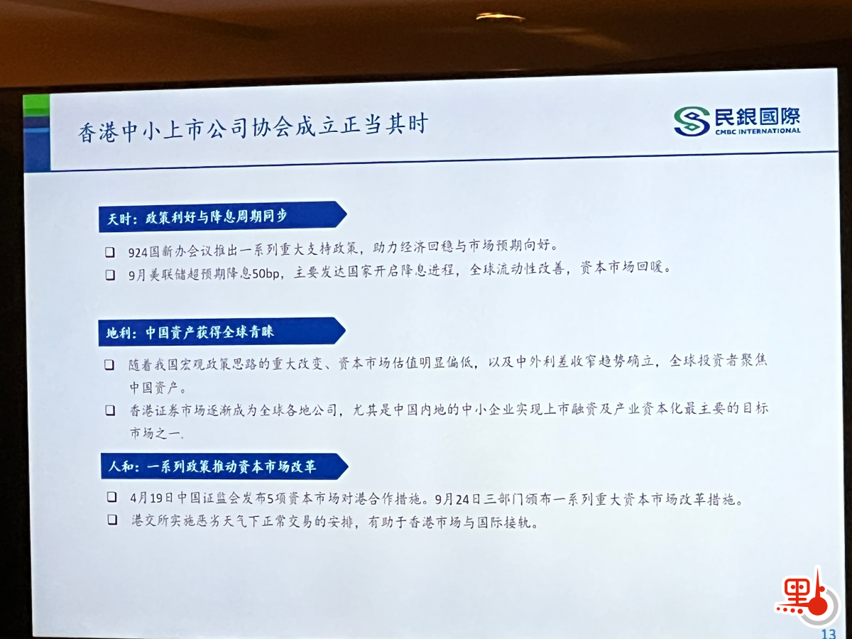【點新聞報道】香港中小上市公司協會成立典禮於今日(9日)舉行。在專題分享環節,民銀資本執行董事兼董事會主席李寶臣指出,香港中小上市公司協會成立正當其時。李寶臣表示,政策利好與降息周期同步,「924國新辦會議」推出一系列重大支持政策,助力經濟回穩與市場預期向好。同時,9月美聯儲超預期降息50bp,主要發達國家開啟降息進程,全球流動性改善,資本市場回暖。