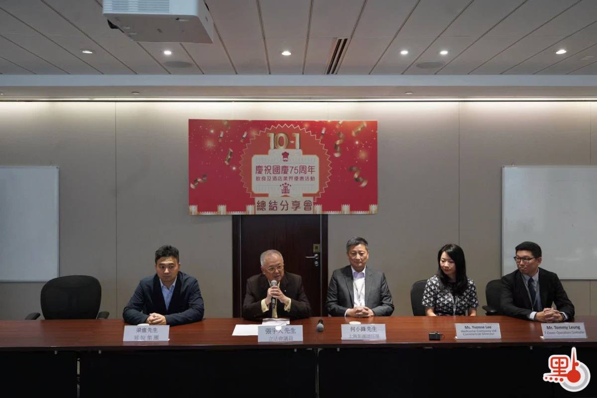 【點新聞報道】今個國慶黃金周期間,特區政府與社會各界推出一系列活動和優惠,與市民和遊客共賀國慶。飲食及酒店業界今日(10日)聯合舉行記者會,總結「國慶優惠活動」對業界的影響。立法會議員張宇人、太興集團總經理何小鋒、昇悅集團代表梁進、富臨集團代表楊浩宏、惠康集團代表Yvonne Lee,7-11代表Tommy Leung出席。