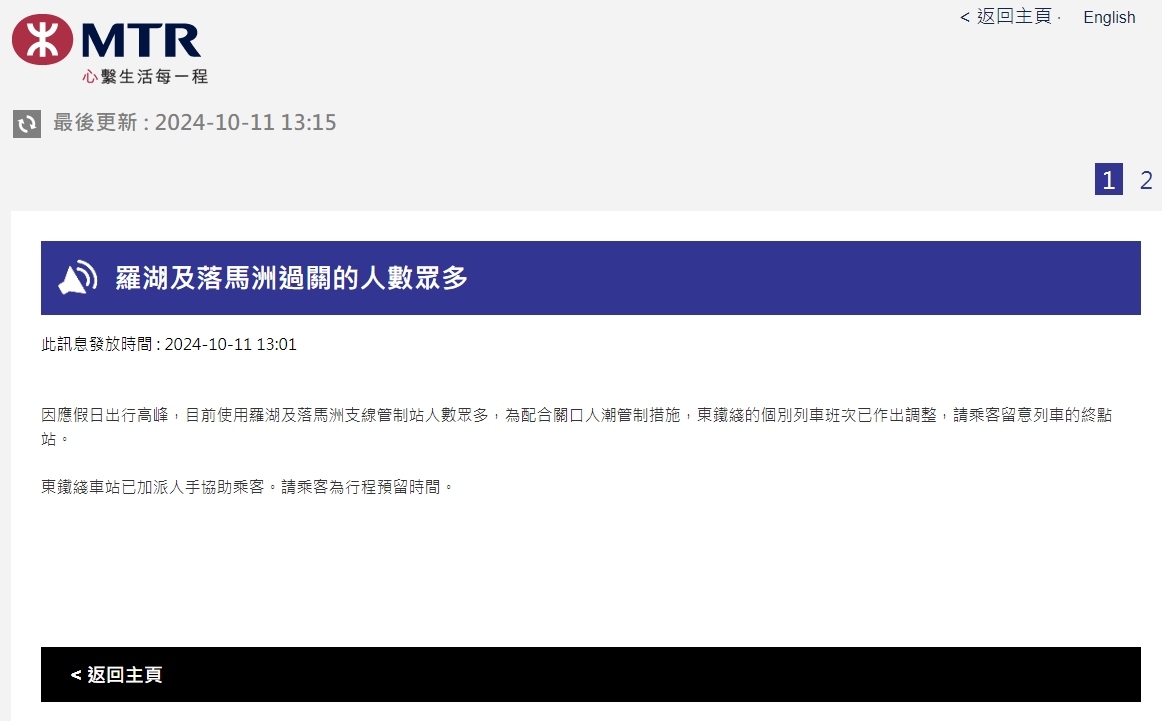 港鐵下午約1時表示,因經羅湖管制站及落馬洲支線管制站過關的乘客較多,為配合關口人潮管制措施,東鐵綫前往羅湖或落馬洲站的列車班次已作出調整,個別列車的終點站改為大埔墟站,前往羅湖或落馬洲站的乘客,需先下車然後乘搭下一班車繼續行程。