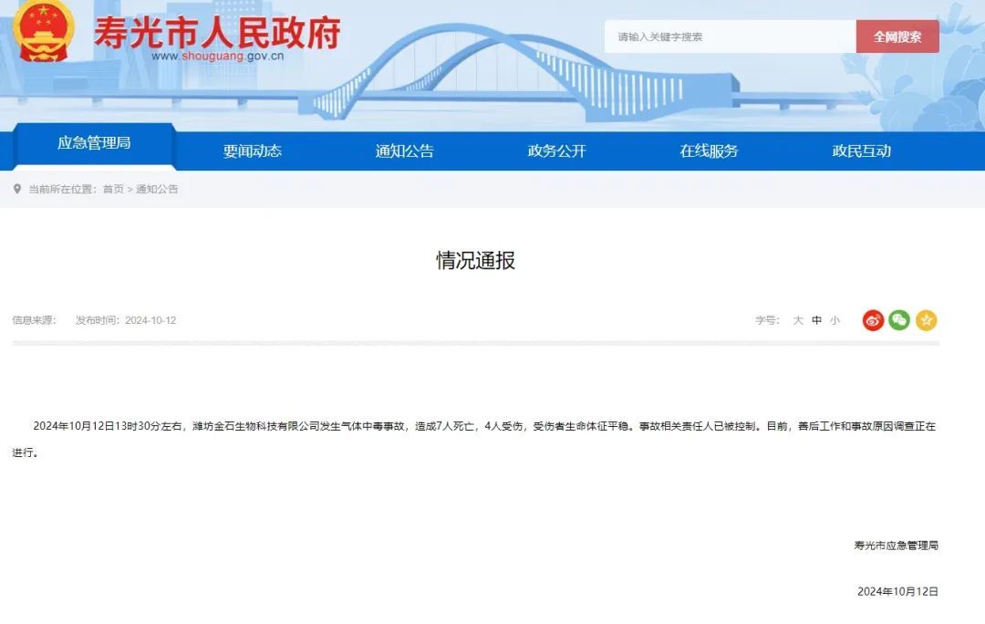 【點新聞報道】據山東省壽光市應急管理局消息,10月12日13時30分左右,山東濰坊市壽光市羊口鎮濰坊金石生物科技有限公司發生氣體中毒事故,造成7人死亡,4人受傷,受傷者生命體徵平穩。事故相關責任人已被控制。目前,善後工作和事故原因調查正在進行。