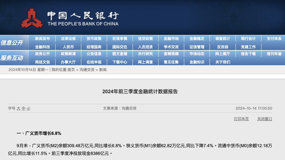 【點新聞報道】央行今日(14日)發布2024年前三季度金融統計數據報告。