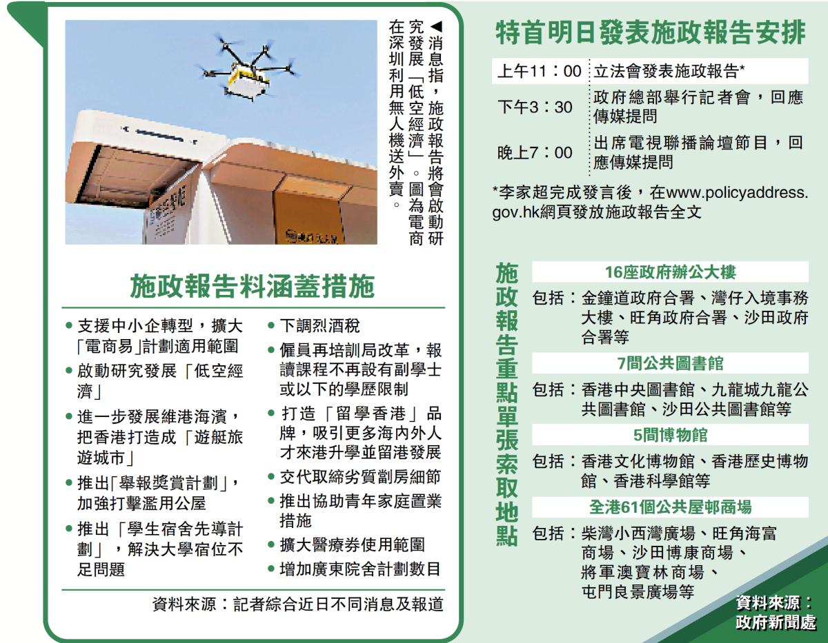 李家超明日行程緊密,早上十一時在立法會,發表任內第三份施政報告,緊接下午三時半出席記者會,回應傳媒提問,晚上七時再在電視論壇節目,闡釋報告內容。市民在明日中午,可以在16座政府辦公大樓、7間公共圖書館、5間博物館,以及全港61個公營商場,免費索取施政報告重點單張。