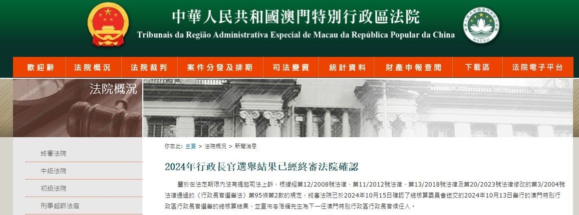 新聞稿指出,鑒於在法定期限內沒有提起司法上訴,根據經第12/2008號法律、第11/2012號法律、第13/2018號法律及第20/2023號法律修改的第3/2004號法律通過的《行政長官選舉法》第95條第2款的規定,終審法院已於2024年10月15日確認了總核算委員會送交的2024年10月13日舉行的澳門特別行政區行政長官選舉的總核算結果,並宣布岑浩輝為下一任澳門特別行政區行政長官候任人。