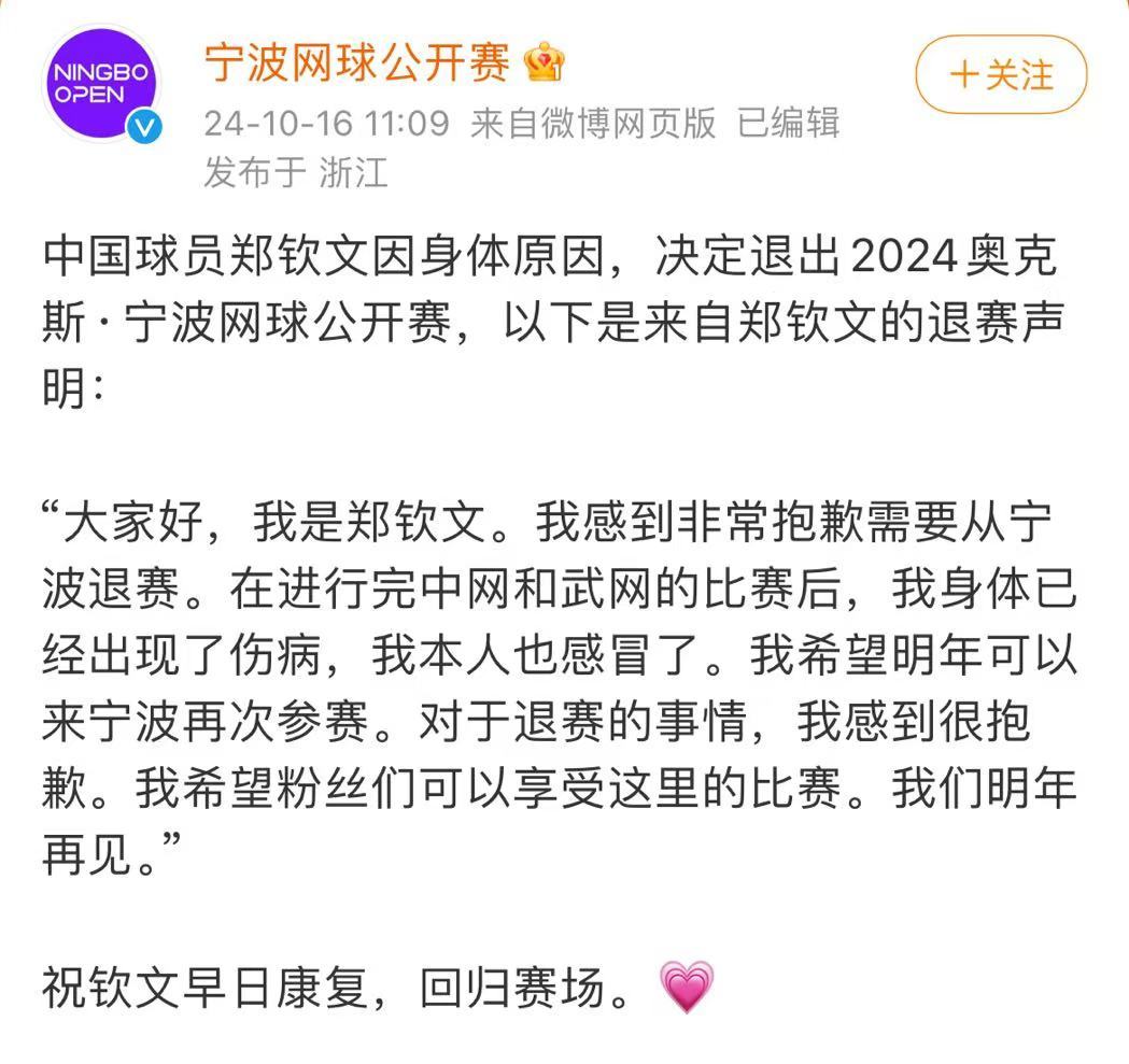 鄭欽文發布退賽聲明:「大家好,我是鄭欽文。我感到非常抱歉需要從寧波退賽。在進行完中網和武網的比賽後,我身體已經出現了傷病,我本人也感冒了。我希望明年可以來寧波再次參賽。對於退賽的事情,我感到很抱歉。我希望粉絲們可以享受這裏的比賽。我們明年再見。」