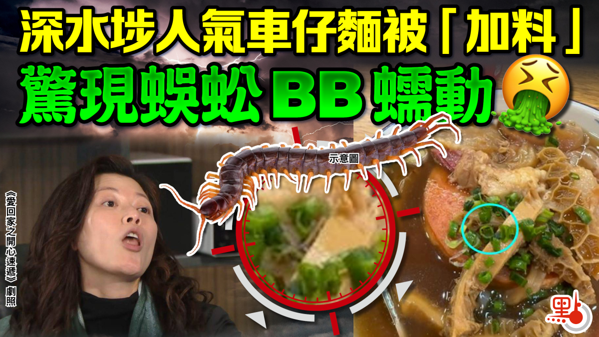【點新聞報道】車仔麵裏竟出現「蛋白質特別版」!有港男在網上發布影片,指早前光顧深水埗一間人氣車仔麵店時,竟發現車仔麵被「加料」,一條深灰色疑似蜈蚣BB藏身於葱花與牛肚之間爬上爬落,讓人看了不禁反胃。樓主立即向店員反映,對方即時換另一碗給他。
