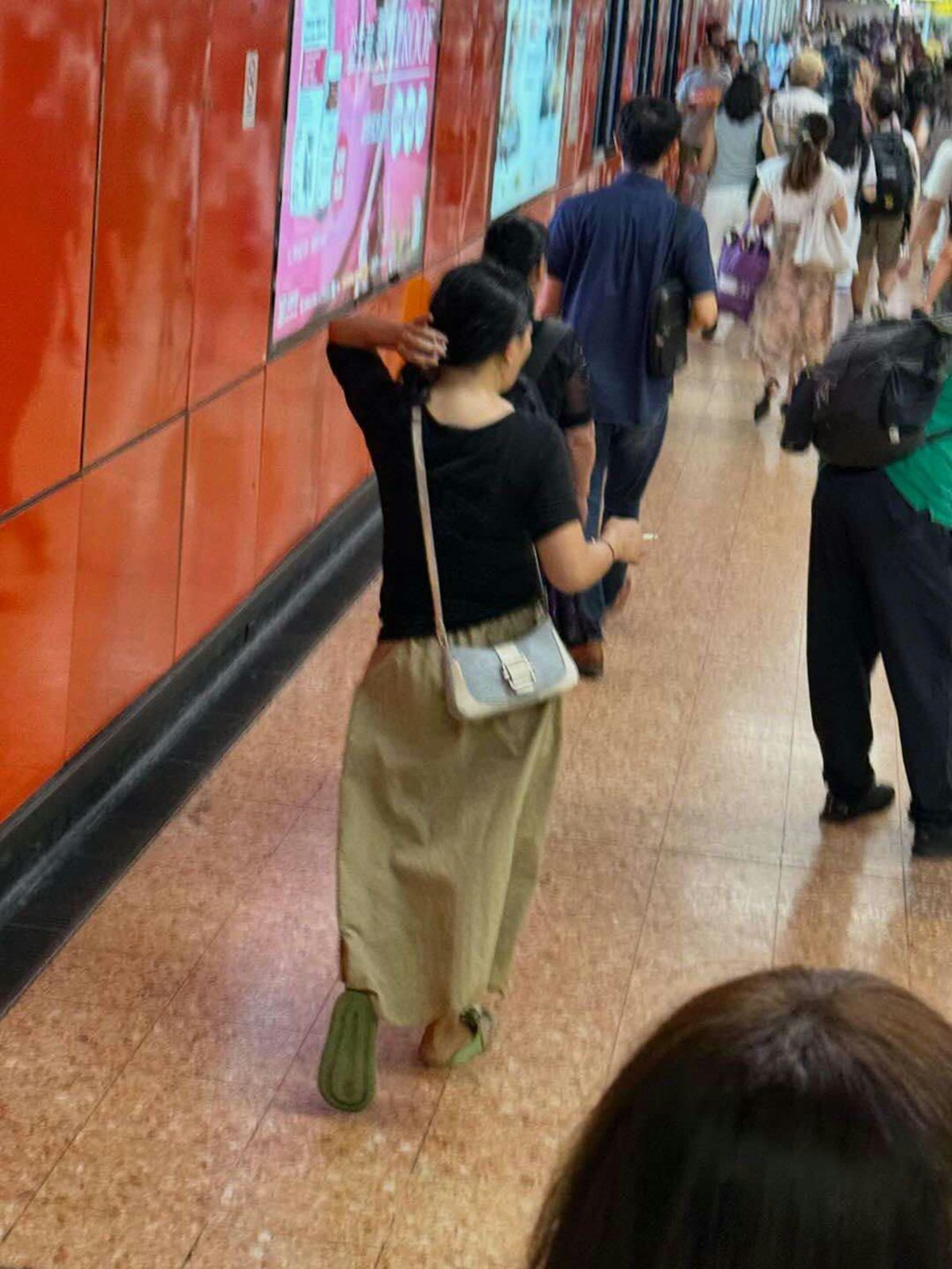 相關照片和影片昨日(16日)起於社交平台群組流傳,該名長裙女子一直背對鏡頭,手持香煙進入大堂港鐵旺角站,及後走近買票機購買車票,雖然未見她當場吸煙,但手上香煙疑已燃點,片中有人傳出咳嗽聲,未知是否被二手煙嗆到不適,全程未見港鐵職員上前介入。