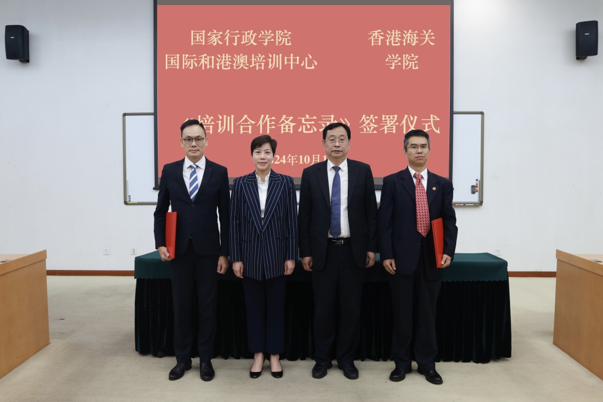 【點新聞報道】香港海關與國家行政學院國際和港澳培訓中心今日(18日)簽署《國家行政學院國際和港澳培訓中心與香港海關學院培訓合作備忘錄》。香港海關關長何珮珊與國家行政學院國際和港澳培訓中心主任謝煜桐,在北京國家行政學院共同簽署協議,雙方冀建立更恒常緊密的合作關係,進一步加強海關人員的國情培訓,並在國家發展大局中發揮更積極作用。