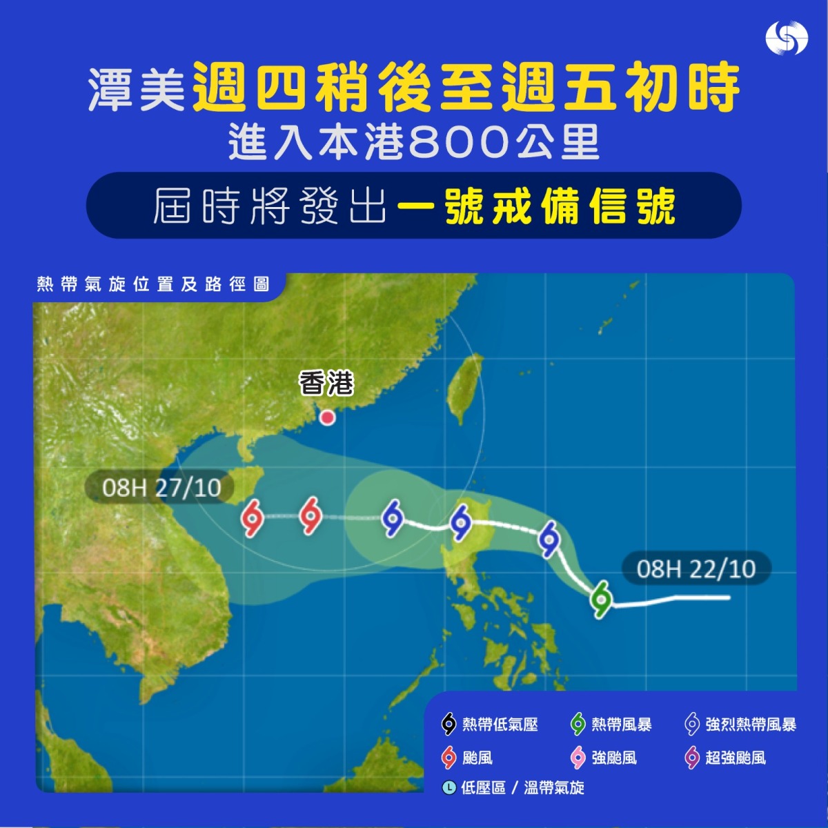 【點新聞報道】香港天文台今晚(22日)發出特別天氣提示,根據現時預測,位於菲律賓以東的熱帶氣旋「潭美」會逐漸增強,並在星期四稍後(10月24日)至星期五初時(10月25日)進入本港800公里範圍,天文台屆時會發出一號戒備信號。