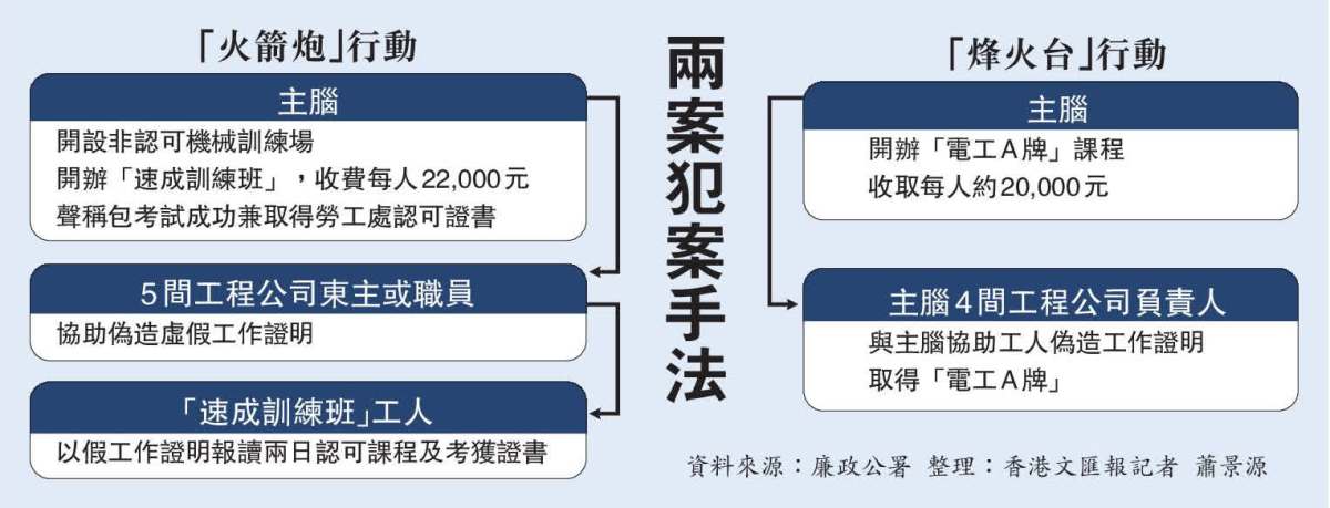 其後,主腦串謀5間工程公司東主或職員,向工人收取500元至1000元,以提供偽造的3年工作經驗證明,讓他們直接報考勞工處認可訓練課程營辦機構舉辦的老手班兩天課程,並串通兩間訓練機構的職員,向無實質經驗的工人發出相關證書。