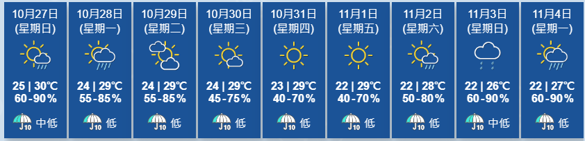 天文台表示,東北季候風會持續影響華南,本周初中國東南沿岸天色較為明朗。而受高空擾動及潭美影響,華南西部沿岸有幾陣驟雨。預料乾燥的東北季候風補充會在本周中至後期影響華南,該區早晚稍涼,日夜溫差較大。